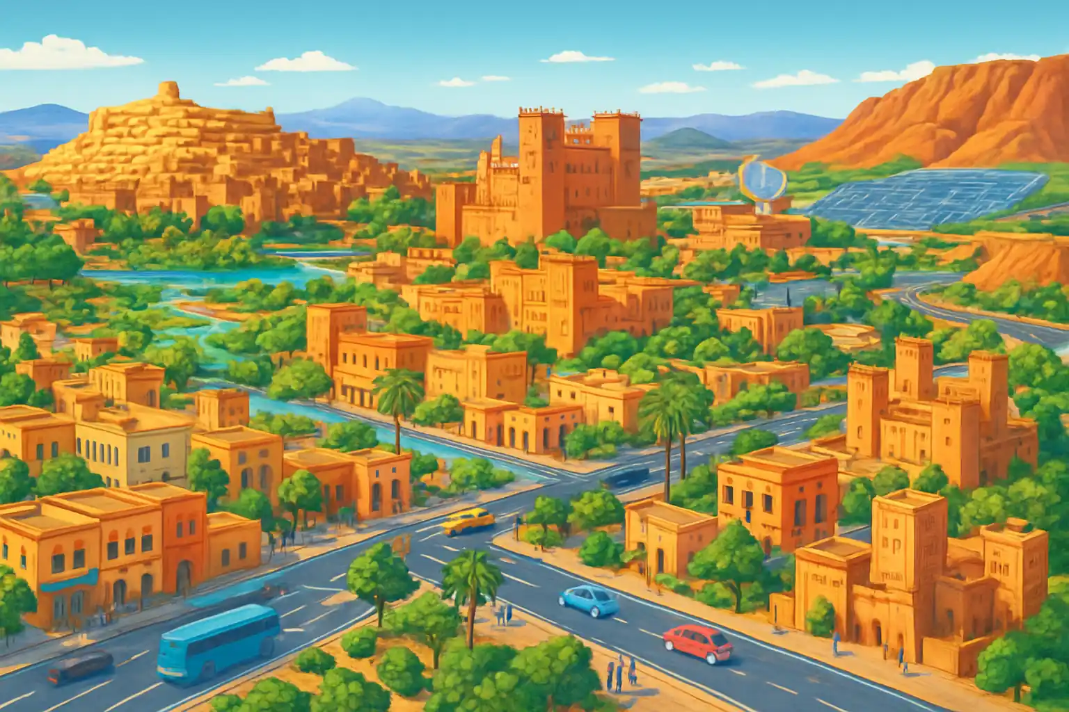 Boka bil med automatväxel om du ska köra Tizi n'Tichka-passet till Marrakech (200 km, 3 h) – de serpentinsvängda bergspassagen är krävande med manuell växellåda. Kontrollera att ditt försäkringsavtal täcker grusvägar om du planerar utflykter mot Jebel Saghro. Ta N10 österut längs Draa-dalen för en av Marockos vackraste körsträckor med palmer och kasbahs.