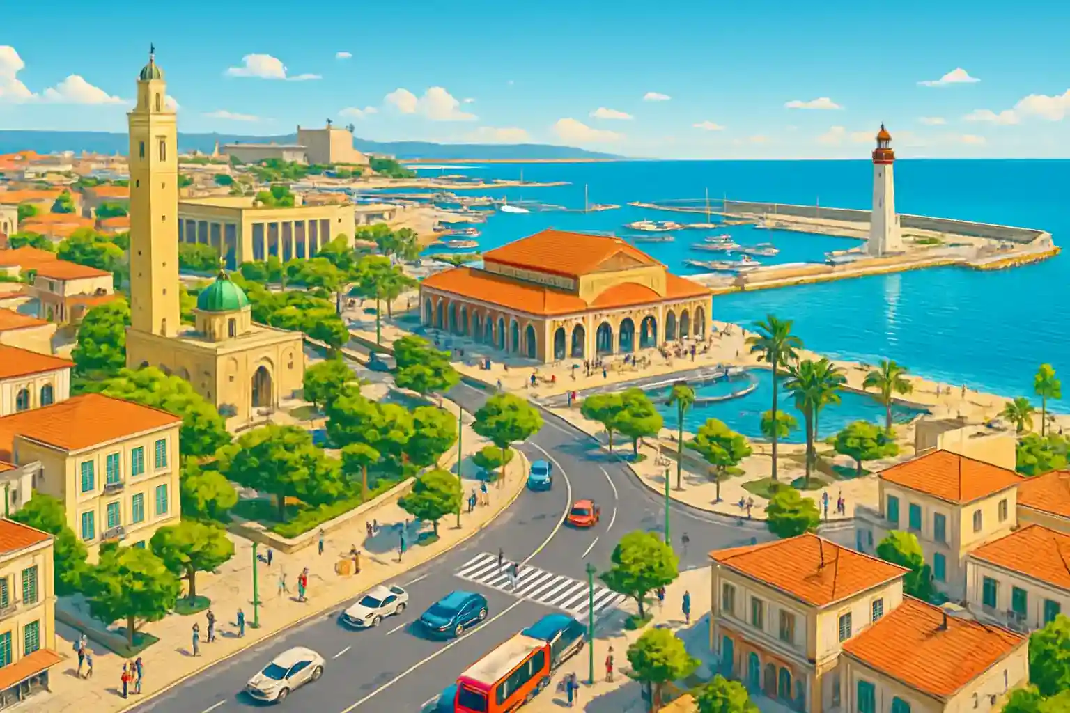 Kontrollera att bilen har vignett och att uthyraren inkluderar vägassistans – vägarna mot Tunis centrum kan vara livliga under rusningstid 07–09. Kan jag hämta bil direkt när färjan eller kryssningsskeppet lägger till i La Goulette? Ja, det finns en biluthyrare i hamnanläggningen, men öppettiderna är kopplade till fartygsankomster.