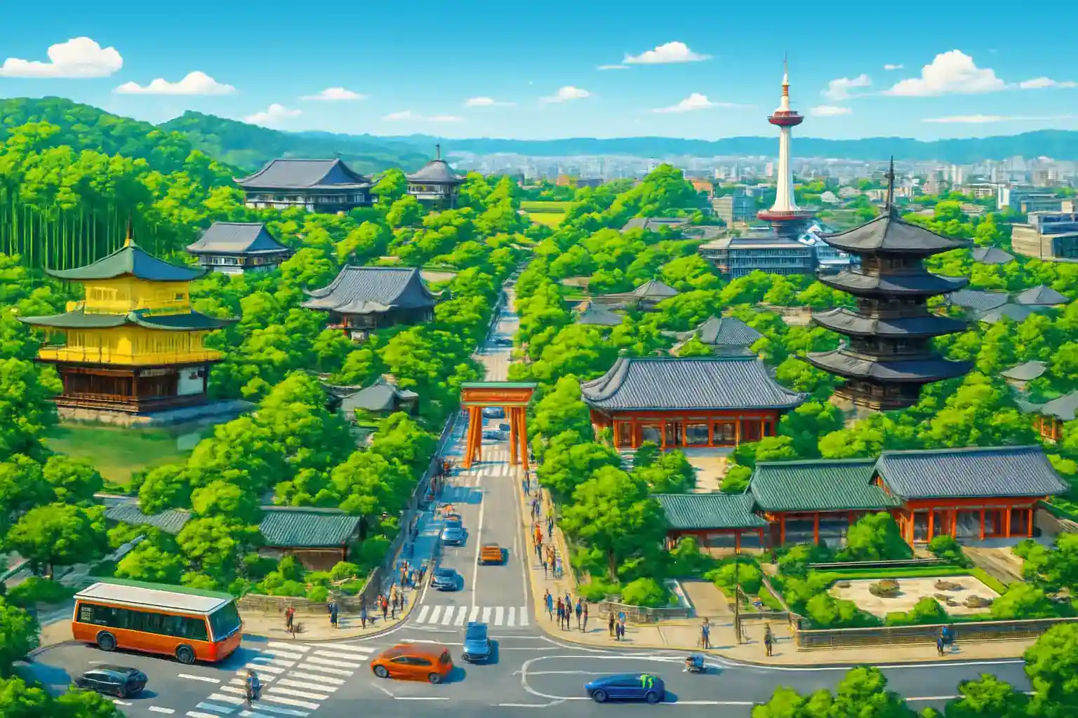 Arashiyama-bambuskogen ligger ca 10 km västerut, ungefär 25 minuters körning via Route 9. Nara med sina heliga hjortar och Todai-ji-templet nås på 45 minuter söderut via motorväg 24. Osaka är bara 55 km sydväst, ca 50 minuters körning via Meishin-motorvägen.