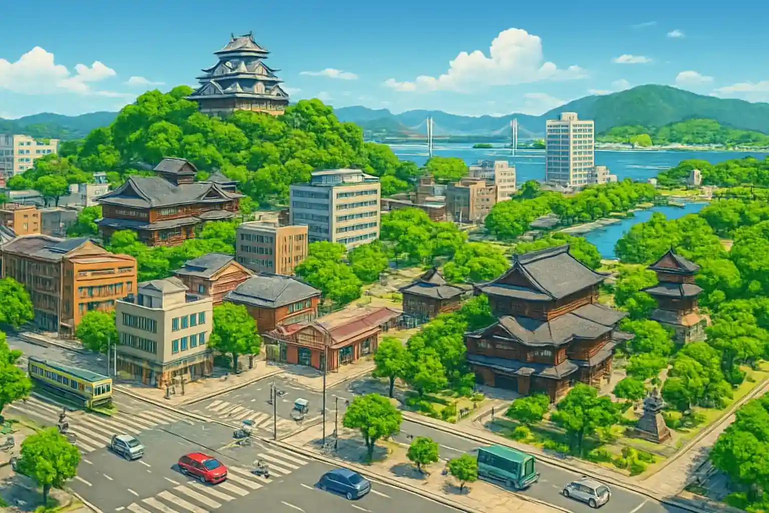 Matsuyama stad med det berömda Dogo Onsen-badet nås på 15 minuter (6 km) via Route 33. Uchiko, en vackert bevarad gammal köpmansby, ligger 40 km söderut (ca 50 min), och Imabari med Kurushima-sundet är 50 km norrut. Shikoku är perfekt för roadtrips – fyll tanken vid flygplatsen innan du ger dig iväg, då bensinstationer kan vara glesa längs kustvägar.