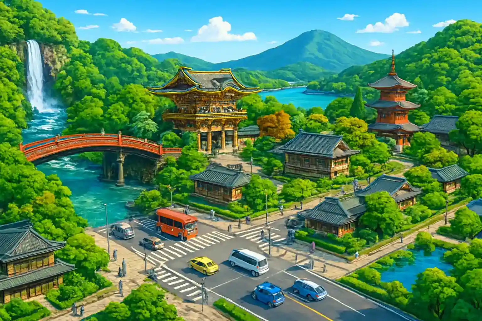 Nikko är känt för Tosho-gu, Japans mest ornamenterade shinto-helgedom och ett UNESCO-världsarv. Kegon-vattenfallet och Chuzenji-sjön nås via den slingrande Irohazaka-vägen, ca 15 km och 25 minuter. Nikko National Park omger staden och erbjuder vandring, onsen och dramatisk natur.