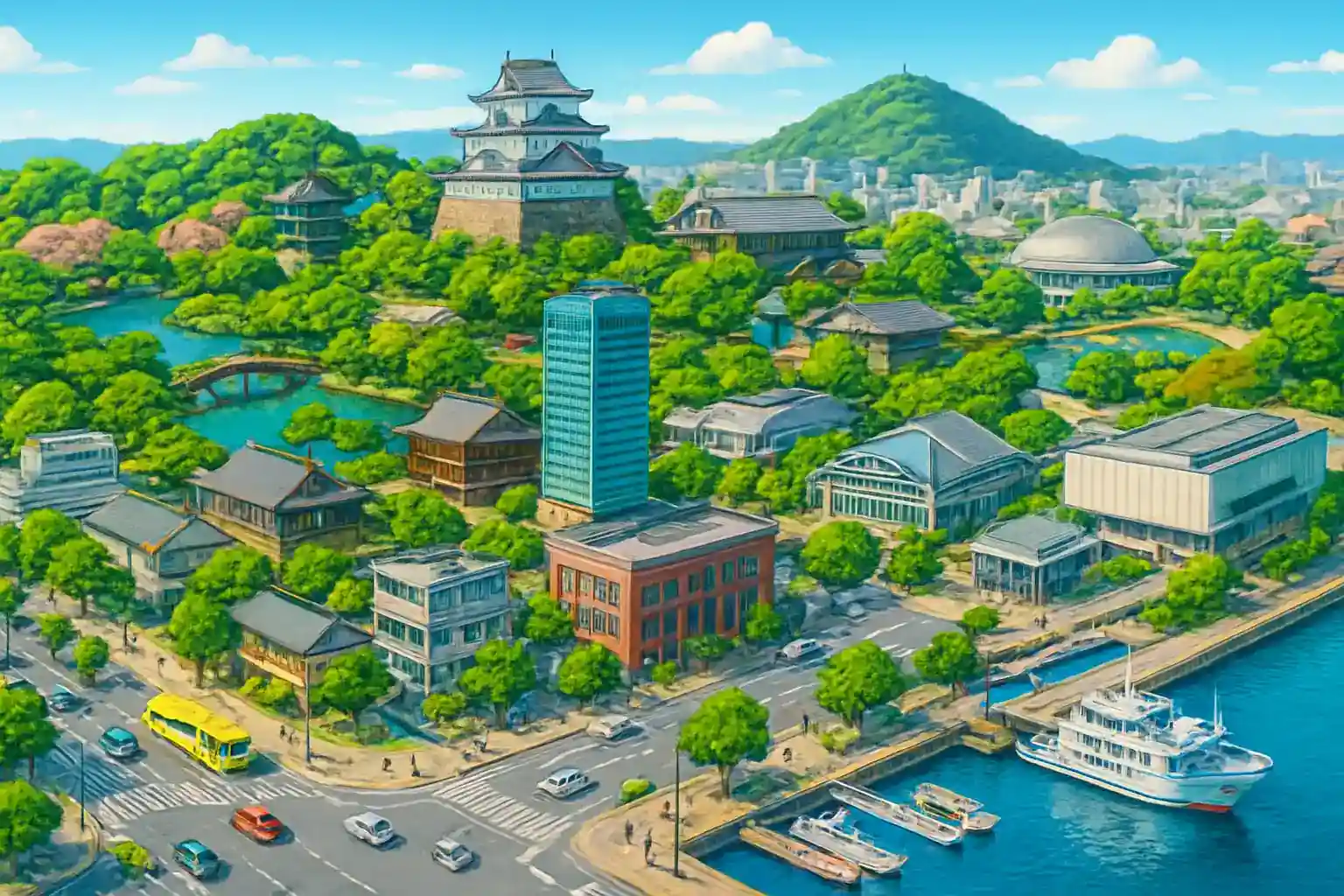 Ritsurin Garden, ett av Japans vackraste historiska trädgårdar, ligger 18 km norrut i Takamatsu centrum. Kotohira-gu (Konpira-san), Shikokus mest besökta helgedom med 785 trappsteg, nås på 40 km västerut. Naoshima konstö nås via färja från Takamatsu hamn, 20 km norrut.
