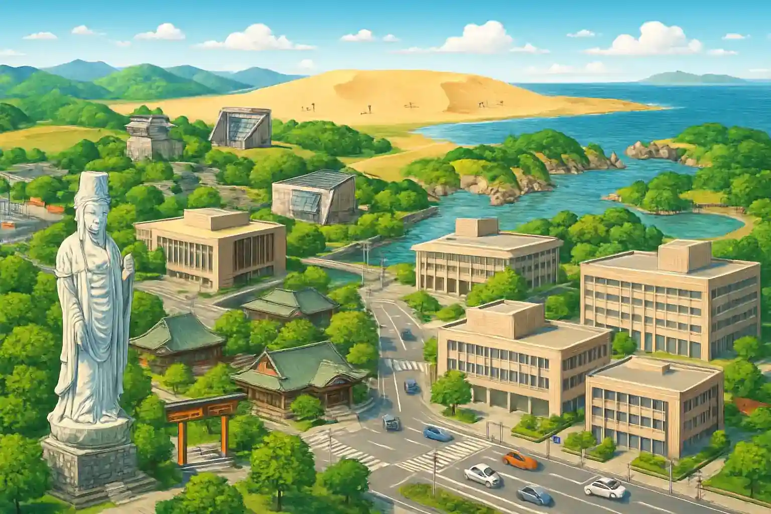 Tottori Prefecture är känd för sina 16 km långa sanddyner längs Japanska havet, ett unikt naturlandskap som lockar 2 miljoner besökare årligen. Uradome Coast, med kristallklart vatten och grottor tillgängliga med glasbåt, ligger 20 km öster om flygplatsen. Tottori stad har ett charmigt slottsruinsområde, Tottori Castle, med panoramautsikt över staden.
