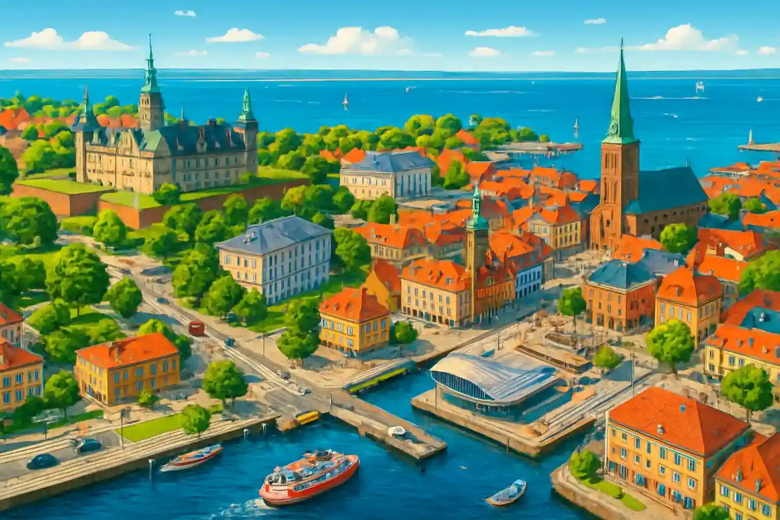 Helsingør ligger 45 km norr om Köpenhamn längs Öresundskusten och nås på ca 45 minuter via E47. Staden är känd för Kronborg Slot (UNESCO-listat), Kulturværftet vid hamnen och den pittoreska gamla stadskärnan med medeltida gränder. Boka färjan till Helsingborg i förväg under sommaren – med bil tar överfarten bara 20 minuter.
