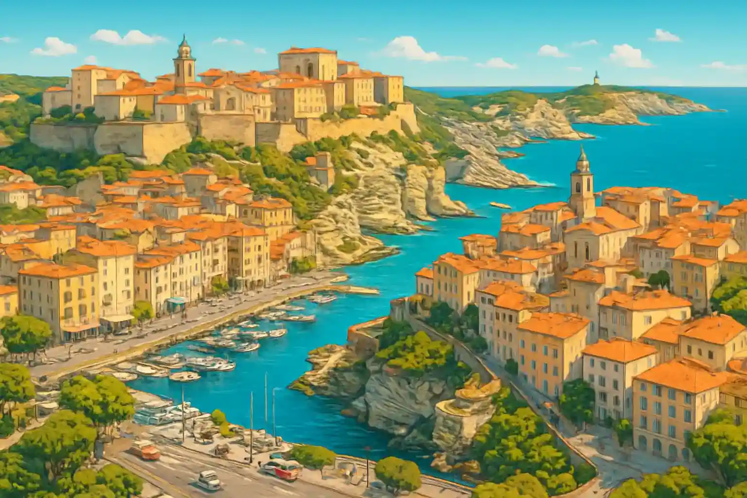 Bonifacio ligger på en kalkstensudde ovanför Bouches de Bonifacio-sundet mot Sardinien, bara 12 km bort. Staden är känd för sin genuesiska citadell, grottor som Grotte du Sdragonato och det kristallklara vattnet i Cala Longa, 8 km österut. Boka hyrbil långt i förväg under juli–augusti då Bonifacio är extremt populärt och utbudet är begränsat.