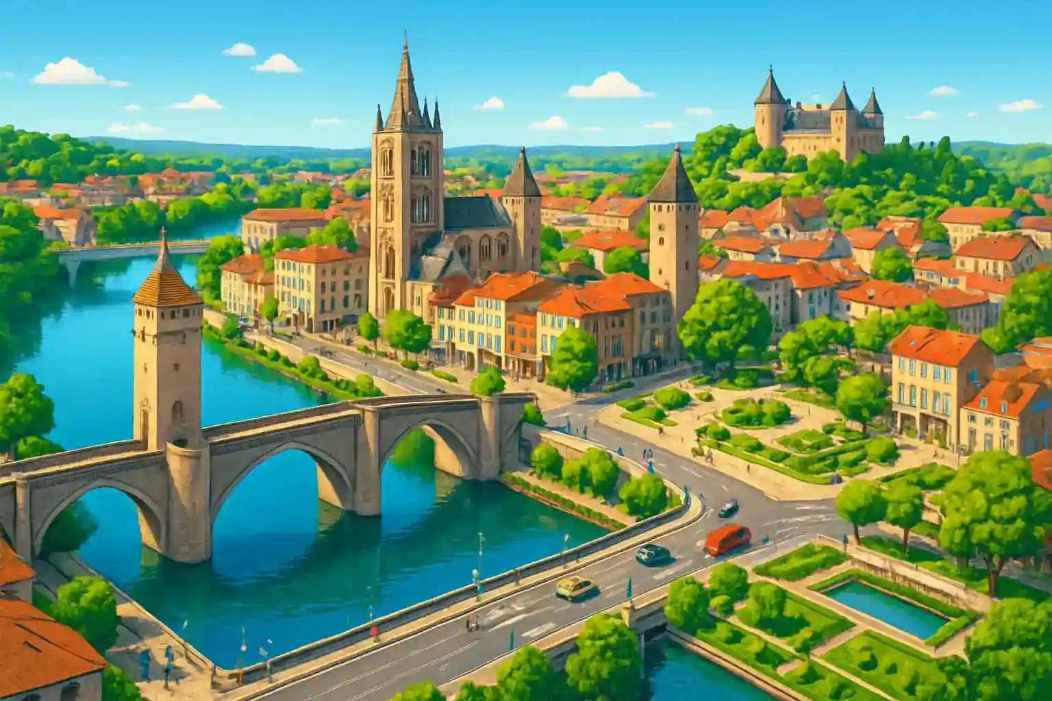 Cahors, huvudstad i departementet Lot, är en pittoresk stad omgiven av en meander i floden Lot, 110 km norr om Toulouse. Med en biluthyrare i centrum kan du utforska Quercy-regionens kalkstenslandskap, vingårdar och medeltida byar. Den ikoniska Pont Valentré från 1300-talet är ett av Frankrikes mest fotograferade broar och ligger bara 1 km från centrum.
