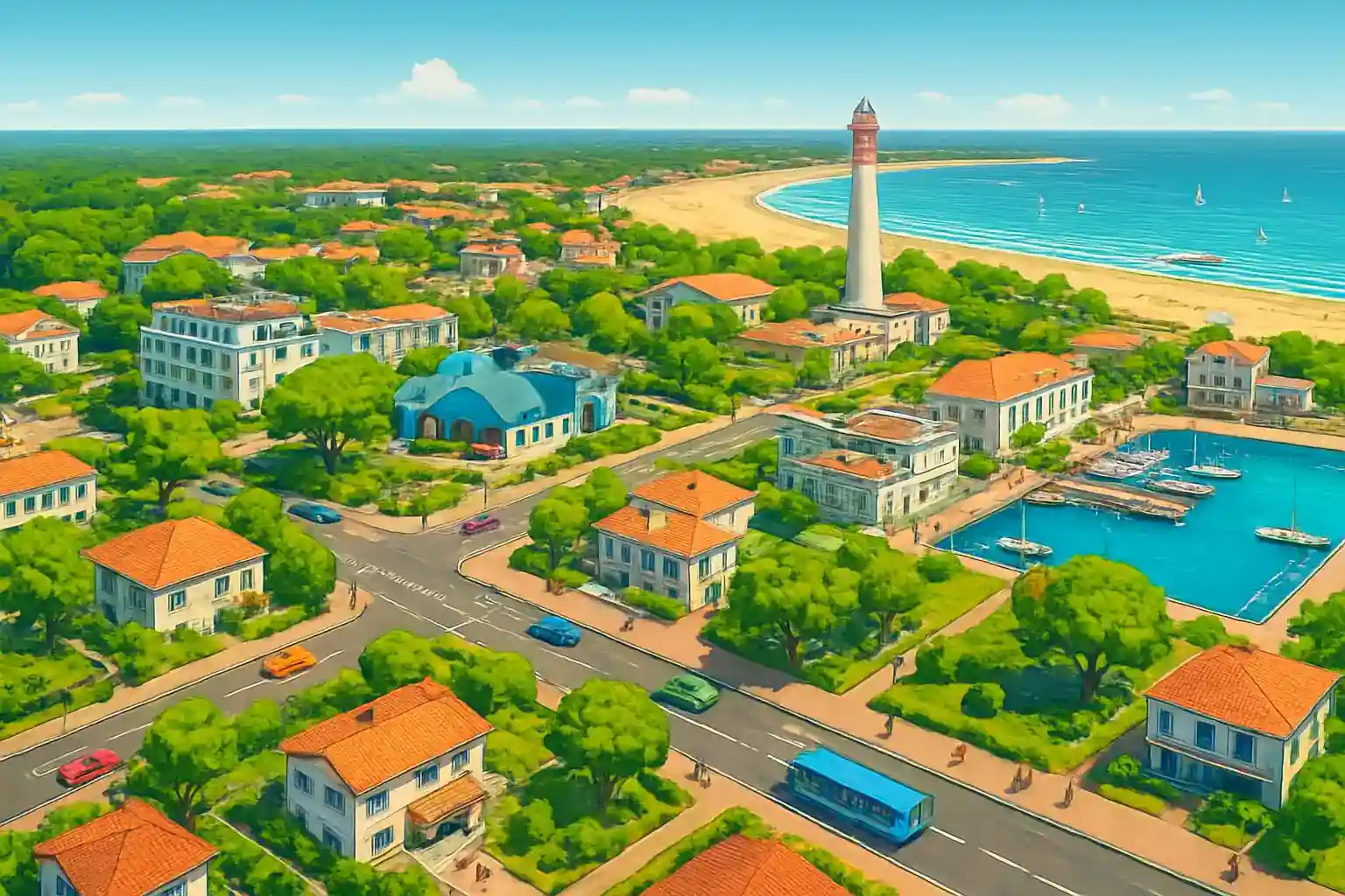 Ta färjan från Royan till Pointe de Grave för en unik bilupplevelse längs Médoc-kusten söderut. Besök Île d'Oléron via bron från Marennes, ca 35 km norrut – en perfekt dagsutflykt. Hur långt är det från Les Mathes till Royan?