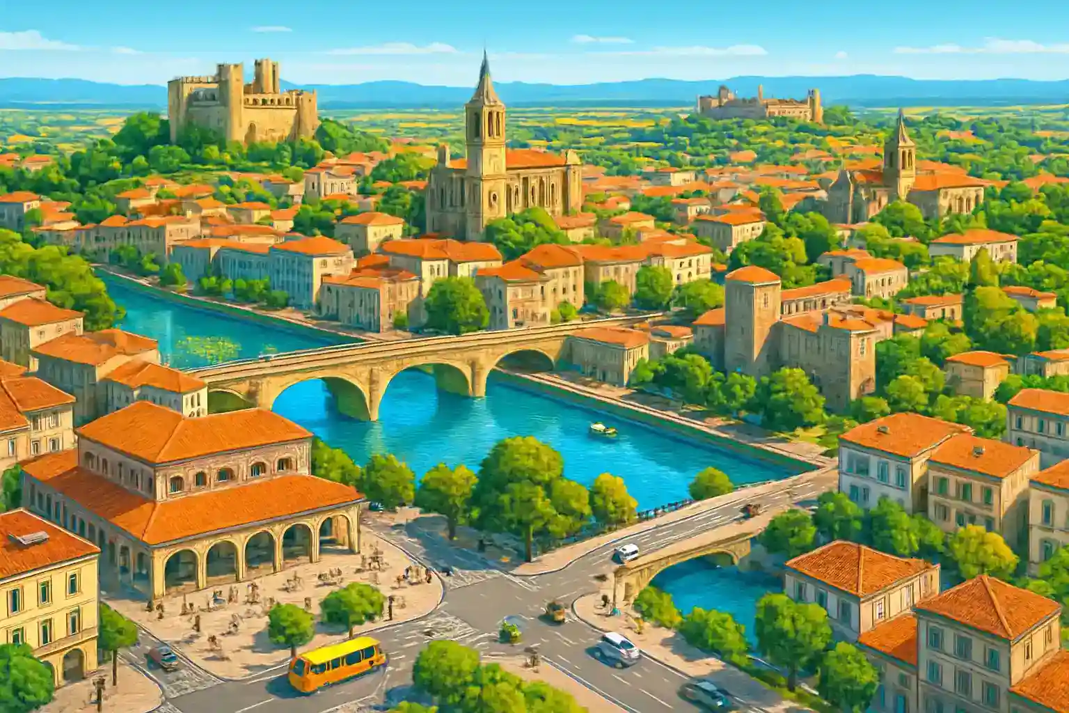 Kan jag nå Pyrénéerna på en dagstur? Ja, Quéribus-borgen och Cucugnan ligger ca 50 km söderut, ungefär 1 timmes körning via D14. Är det lätt att hitta parkering i Lézignan centrum?