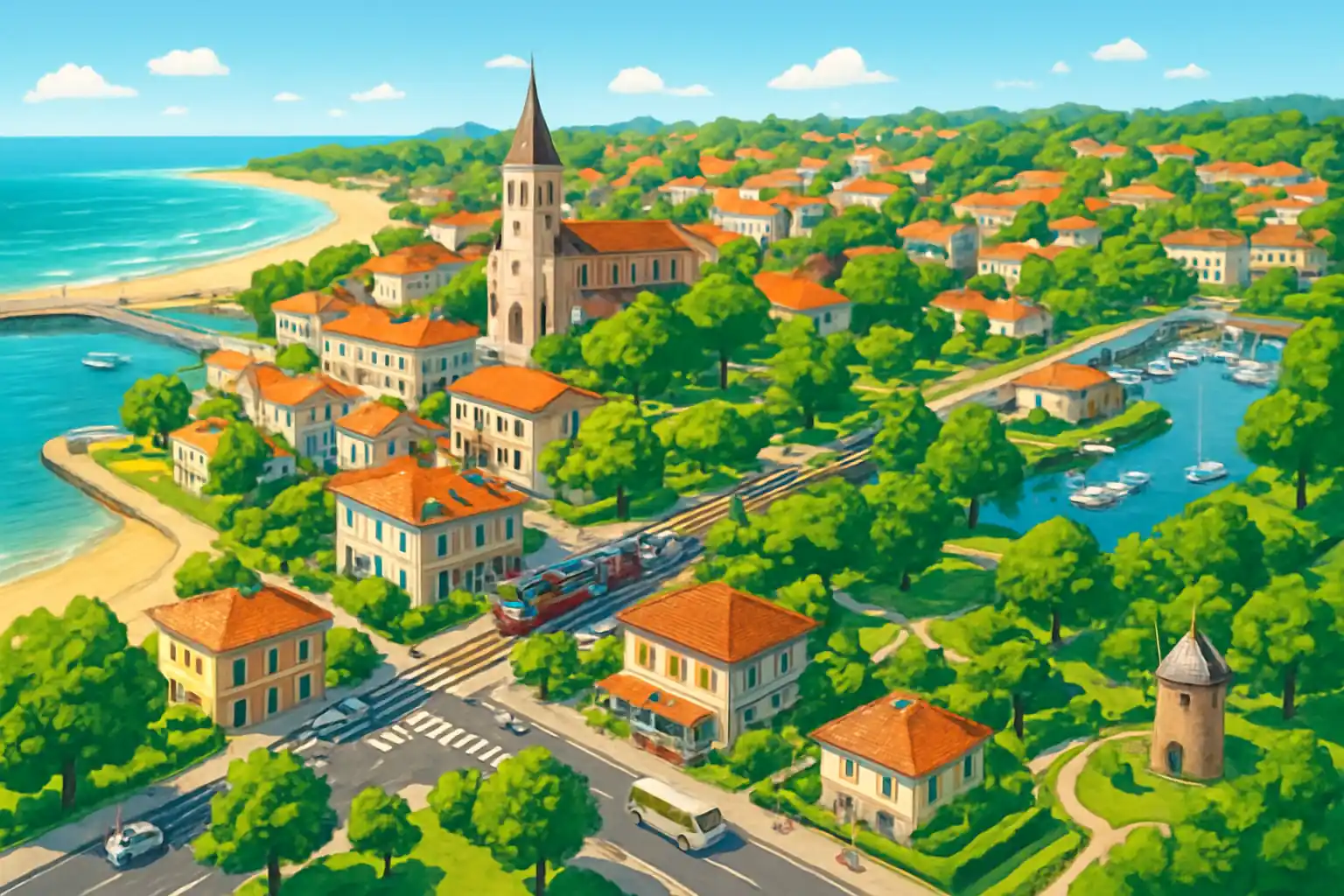 Tarnos gränsar till Bayonne i norr och Hendaye mot Spanien ligger 35 km söderut längs A63. Staden har industrihistoria men omges av stränder och pinjeskogen Les Landes, som sträcker sig mil efter mil norrut. Undvik att köra in i Biarritz centrum under högsommar – parkera utanför och ta buss eller gå.