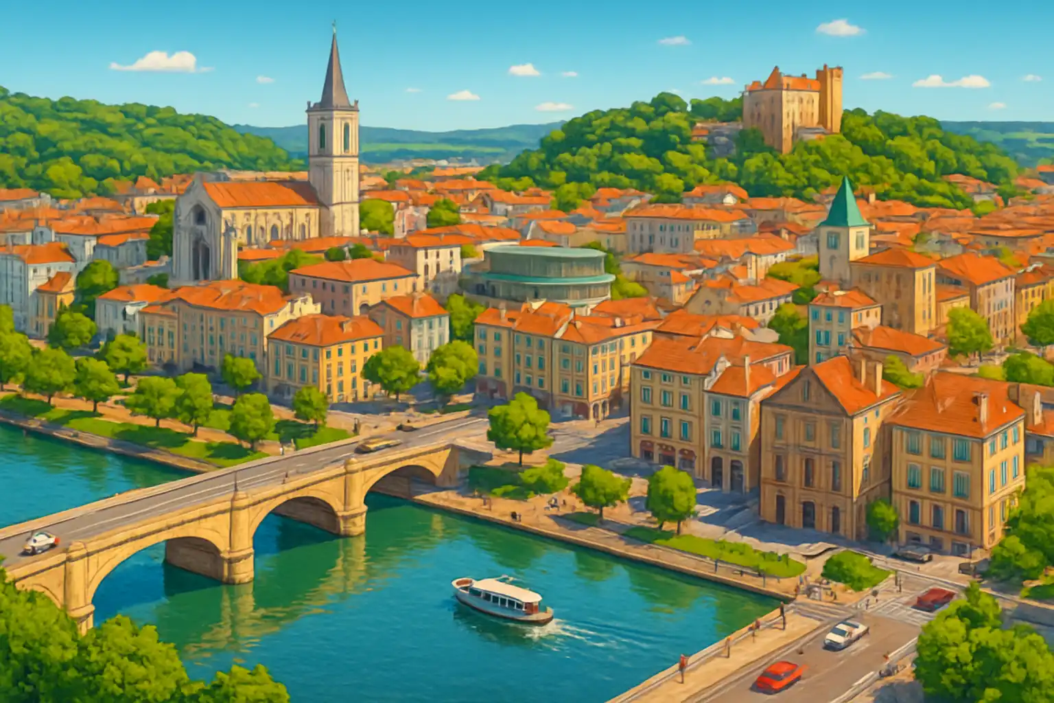 Kör söderut mot Valence (18 km, 20 min) för ett större utbud av restauranger och shopping. Är det lätt att parkera i Tournon centrum med hyrbil? Ja, det finns gratis parkering vid kajen längs Rhône och vid Château de Tournon, vilket gör det enkelt att utforska centrum till fots.