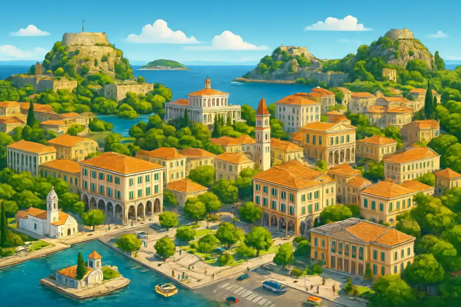 Holiday Palace-området ligger nära den venetianska förorten Perama och utsiktsplatsen över Mouse Island (Pontikonisi), ett av Korfus mest fotograferade motiv. Stranden Kanoni ligger bara 2 km norrut längs kusten. Boka hyrbil i förväg under högsäsong (juli–augusti) då tillgången är begränsad.