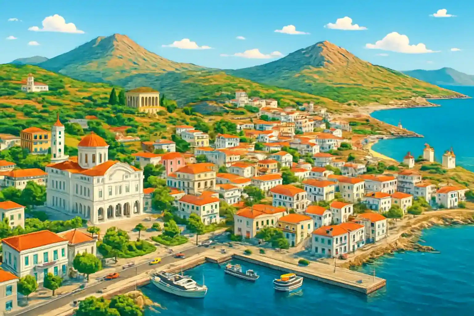 Tinos stad ligger på öns sydkust och är centrum för religiös turism – varje 15 augusti vallfärdar tusentals till Panagia Evangelistria. Från centrum är det 12 km till Exomvourgo, öns historiska fästningsklippa, och 28 km till marmarbyn Pyrgos med sina verkstäder och museum. Boka hyrbil i god tid inför 15 augusti då ön är fullpackad med pilgrimer och tillgängligheten drastiskt minskar.