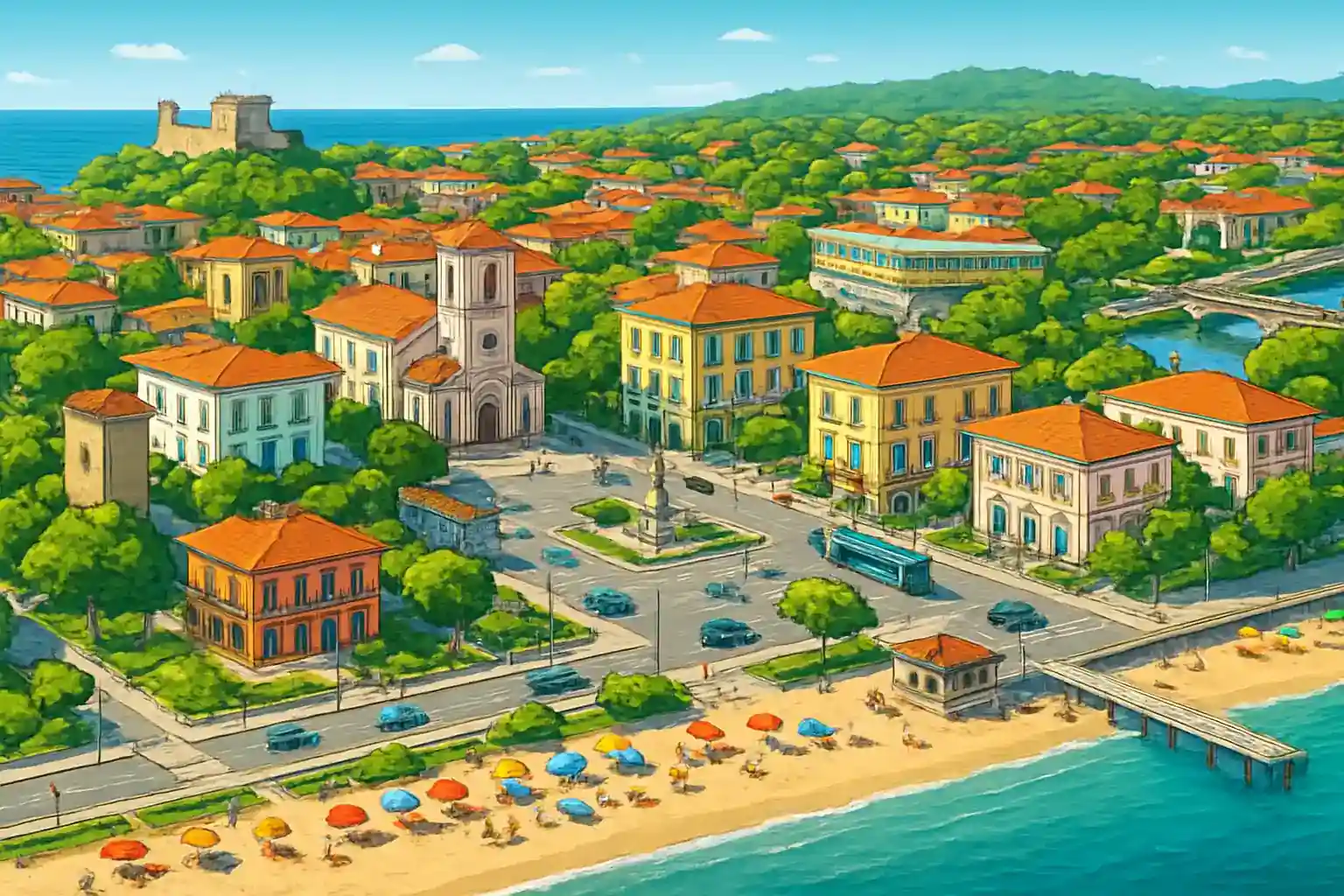 Parkera bilen vid pinjeskogens utkant och cykla in till stranden – biltrafiken i centrum är kraftigt begränsad under sommaren. Boka hyrbilen i god tid under juli–augusti då tillgången är mycket begränsad. Kör norrut längs SS1 Aurelia för fantastisk kustvy mot La Spezia.