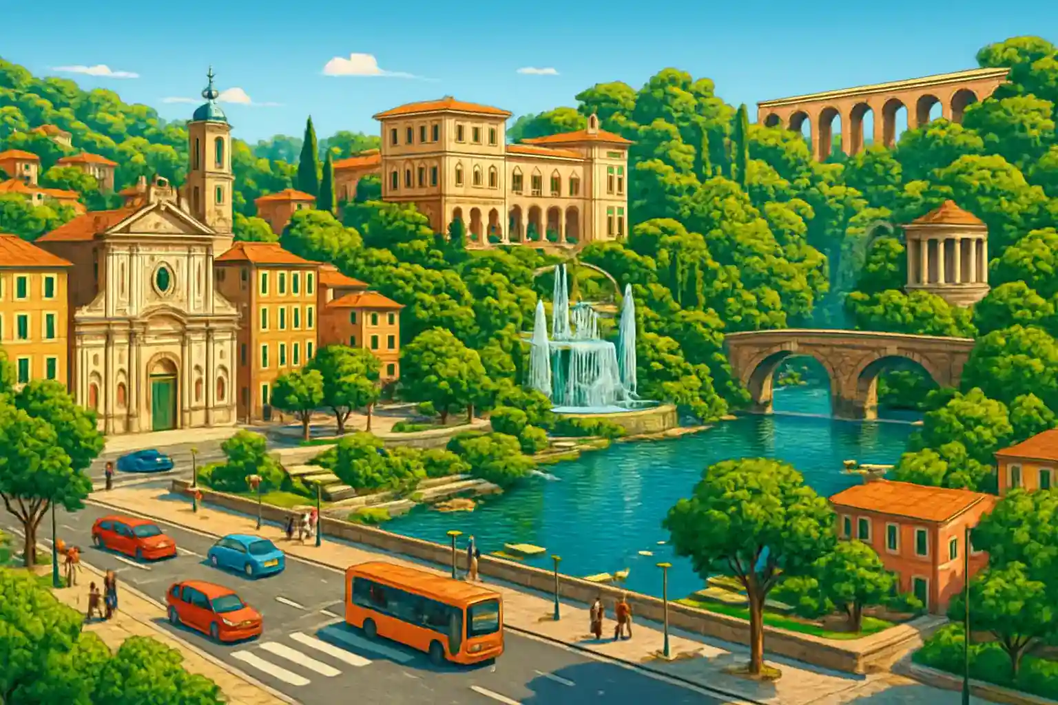 Tivoli Terme Centrum ligger drygt 30 kilometer öster om Rom längs Via Tiburtina, vilket gör det till en utmärkt utgångspunkt för att utforska den romerska landsbygden. Härifrån når du det berömda Villa d'Este med sina spektakulära renässansträdgårdar och fontäner på bara några minuter, och Villa Adriana, kejsar Hadrianus magnifika antika residens, ligger ännu närmare. Kör du söderut på motorvägen når du Roms centrum på ungefär 45 minuter, medan en körsträcka österut längs bergsvägen tar dig in i Sabinerbergen med pittoreska byar som Subiaco.