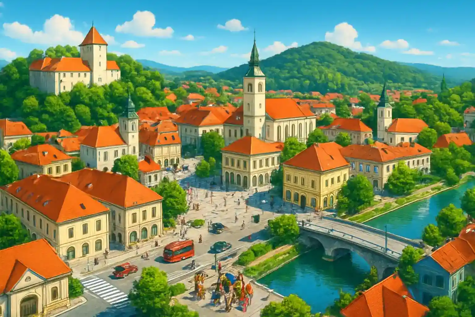 Samobor är en charmig liten stad 25 km väster om Zagreb, känd för sina kremšnite-kakor och pittoreska torg. Med hyrbil från stadens centrum når du Zagrebs internationella flygplats på bara 30 minuter och Sloveniens gräns på 20 km. Utmärkt bas för dagsutflykter till Žumberak-bergen.