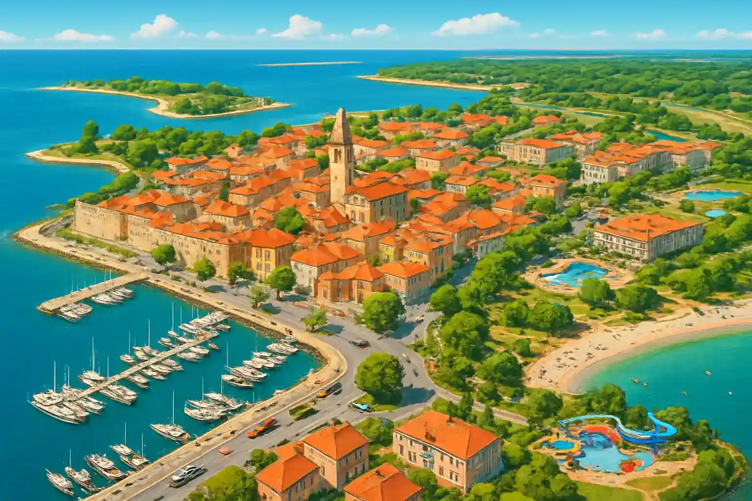 Umag är en charmig kuststad i norra Istrien, känd för ATP-tennisturneringen och sin venetianska gamla stad vid havet. En uthyrare finns i centrum, vilket ger dig möjlighet att utforska hela Istrienhalvön med bil. Läget nära den slovenska och italienska gränsen gör Umag till en strategisk startpunkt för gränsöverskridande resor.