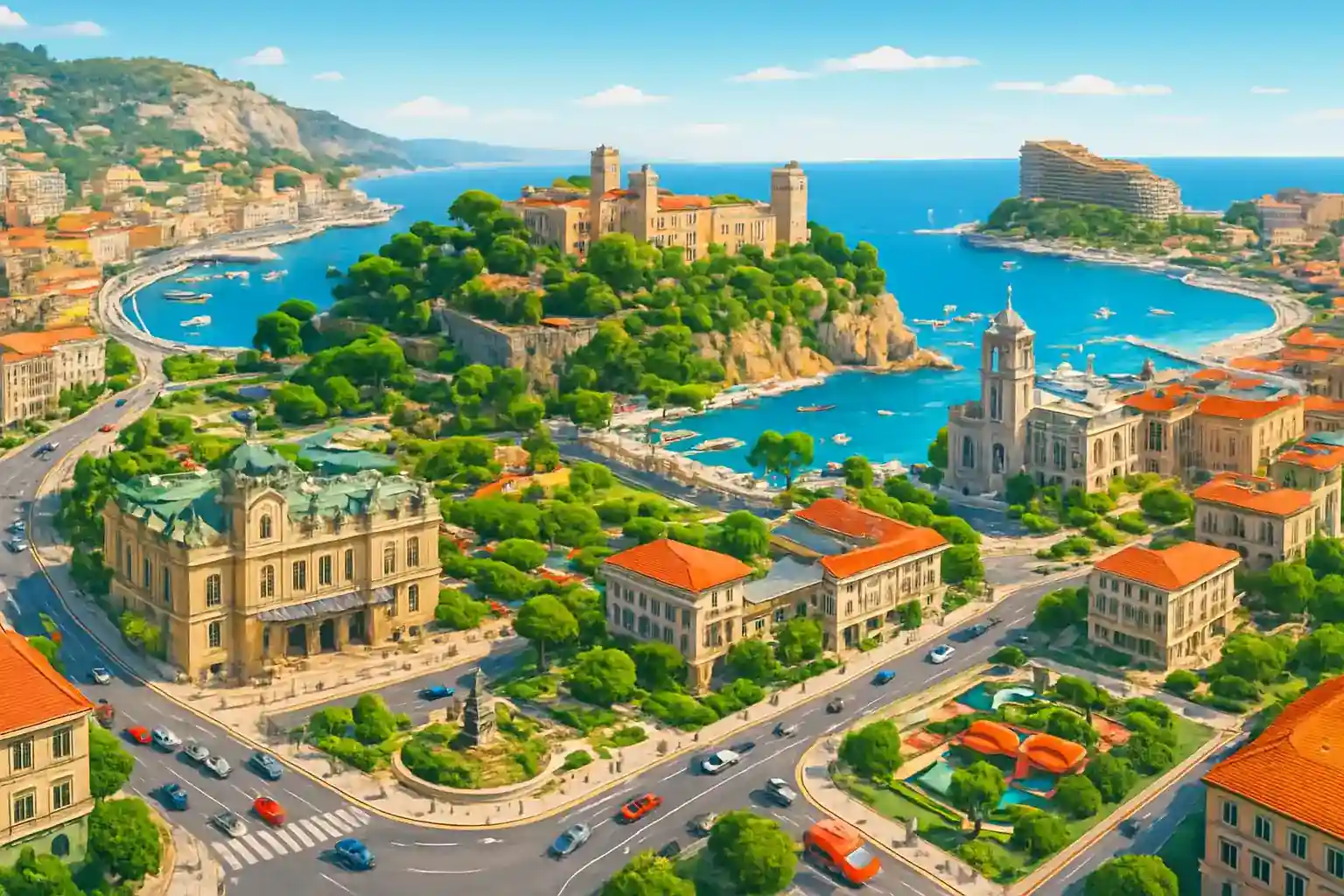 Monaco centrum är beläget kring Port Hercule och de omgivande kvarteren med lyxbutiker och restauranger längs Boulevard des Moulins. Området är kompakt men extremt välskyltat. Furstliga palatset på Klippan (Le Rocher) är 1,5 km från centrum och nås på 5 minuter med bil.