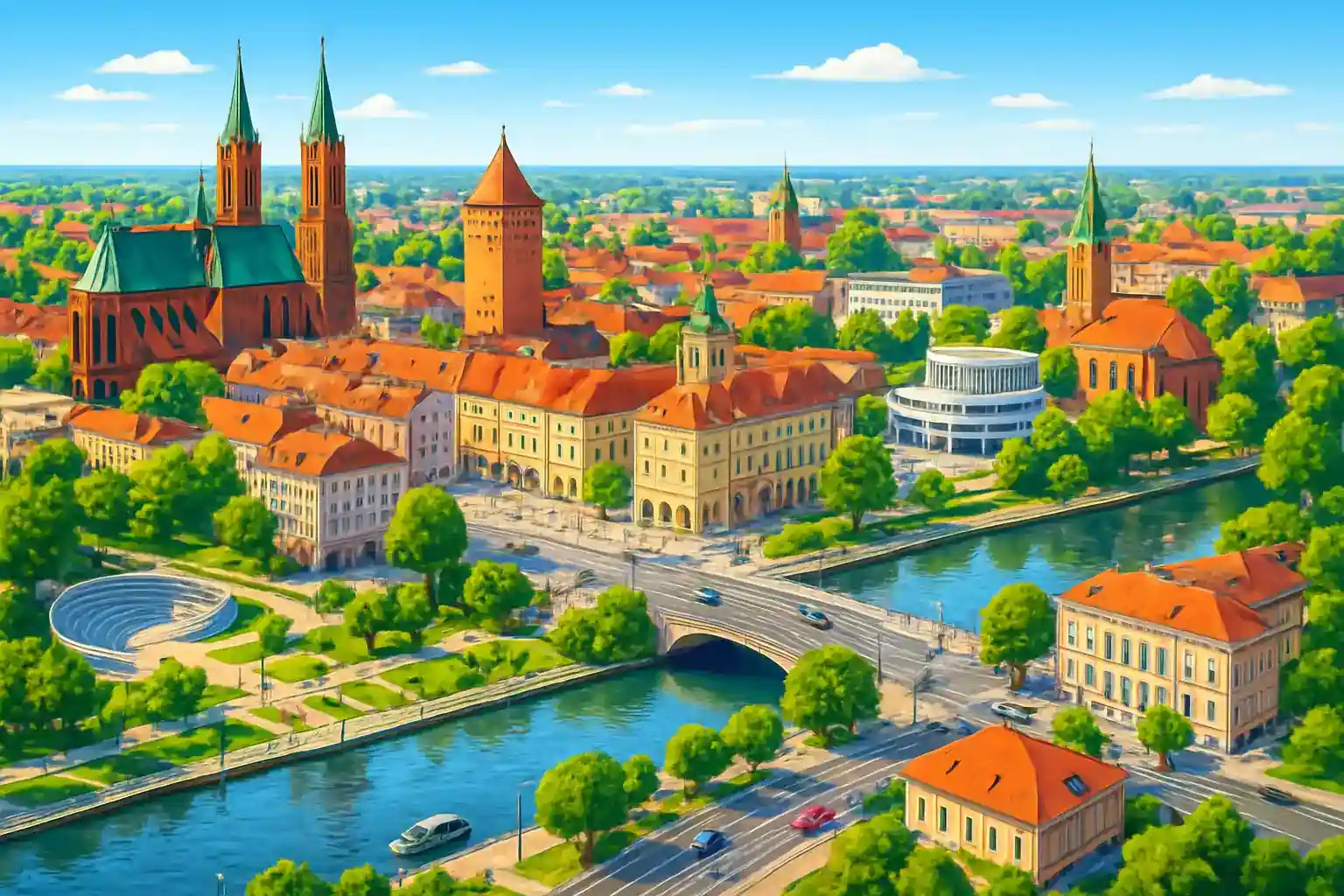 Opole, Schlesiens sångstad och hemvist för det polska schlagerundret, erbjuder hyrbil via 2 uthyrare i centrala lägen. Staden vid floden Oder är ett perfekt nav för att utforska övre Schlesiens kulturlandskap och industrimiljöer. Med hyrbil kan du enkelt kombinera Opole med utflykter till omgivande städer och naturreservat.