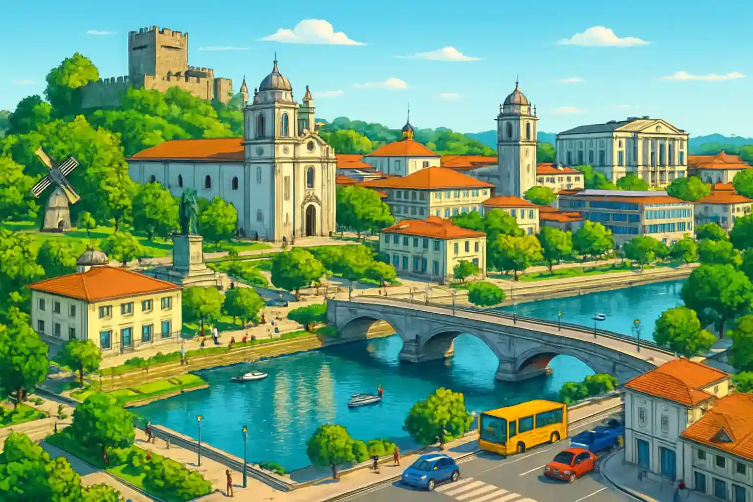 Härifrån är det bara 30 km och cirka 30 minuters körning till Aveiros kanaler och 25 km till kuststaden Espinho med sina stränder. Parkera gärna nära Castelo och gå till fots i gamla staden – trafiken kan vara trång runt slottet under helger. Planerar du besök under Imaginarius-festivalen i maj, boka hyrbil tidigt då efterfrågan ökar kraftigt.