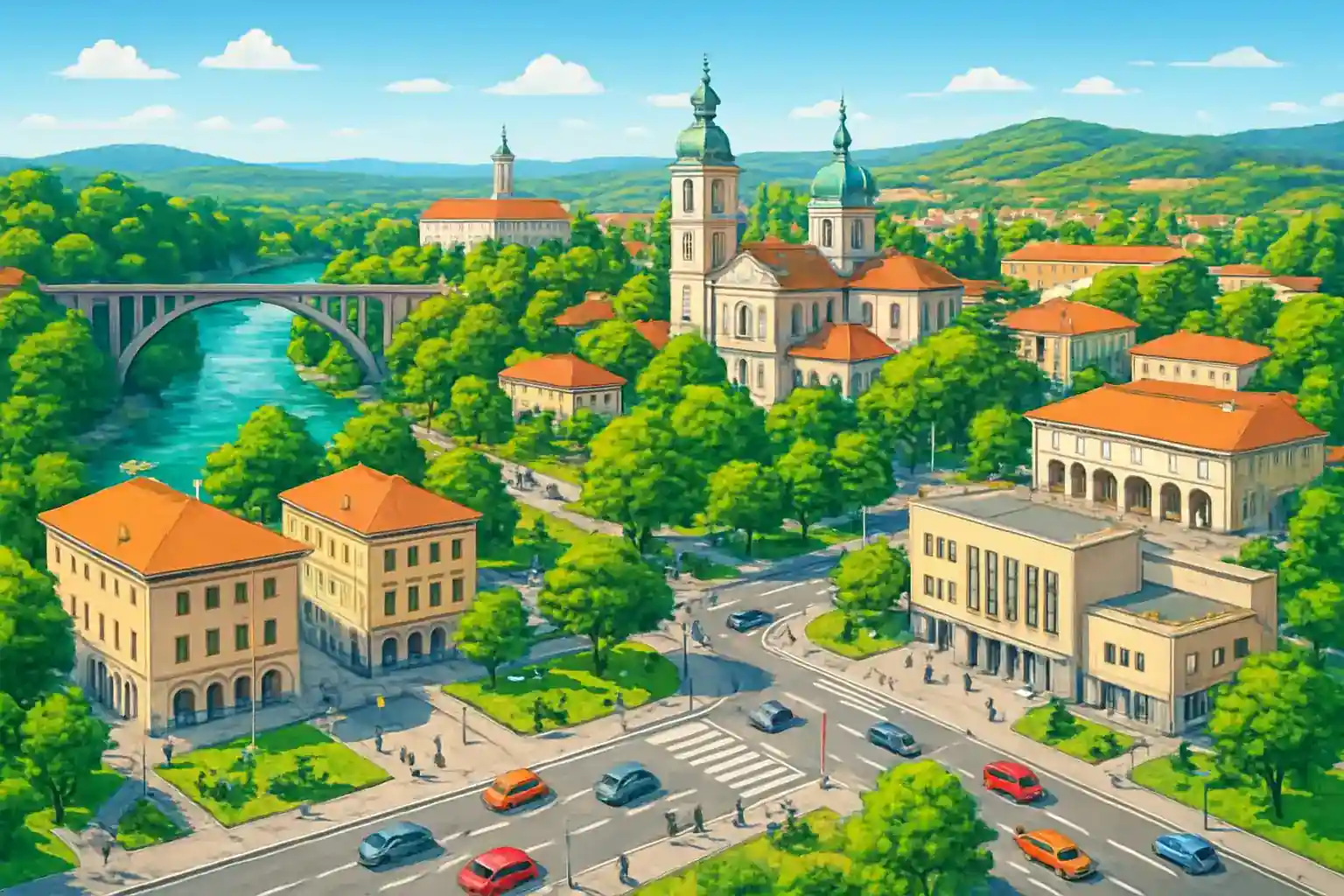 Cirka 70 km söderut längs kusten, vilket tar ungefär 1 timme via Koper. Finns det parkering nära uthyrningskontoret i Nova Gorica centrum? Ja, det finns offentliga parkeringsplatser i centrum nära gränsen mot Gorizia, ofta gratis utanför rusningstid.
