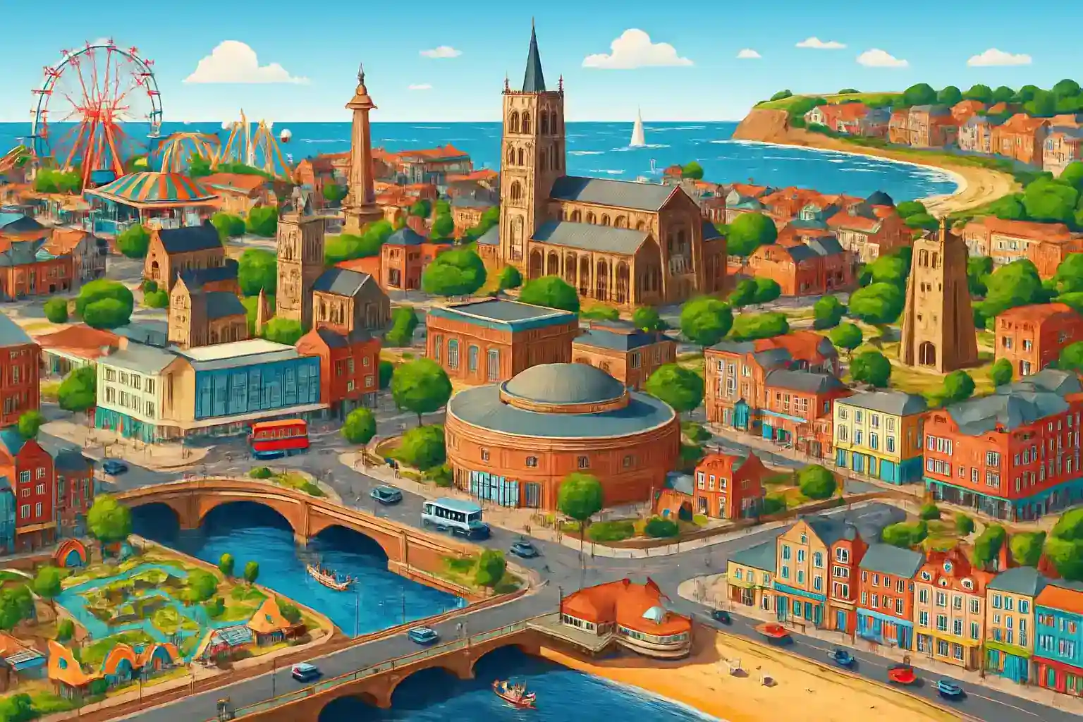 Great Yarmouth är Norfolks populäraste kuststad med en lång sandstrand och traditionell brittisk semesteratmosfär vid Nordsjön. Med hyrbil från centrum kan du utforska Norfolk Broads – Europas största skyddade våtmarksområde – som börjar bara 8 km västerut. Norwich, Norfolks huvudstad, ligger 30 km västerut via A47.
