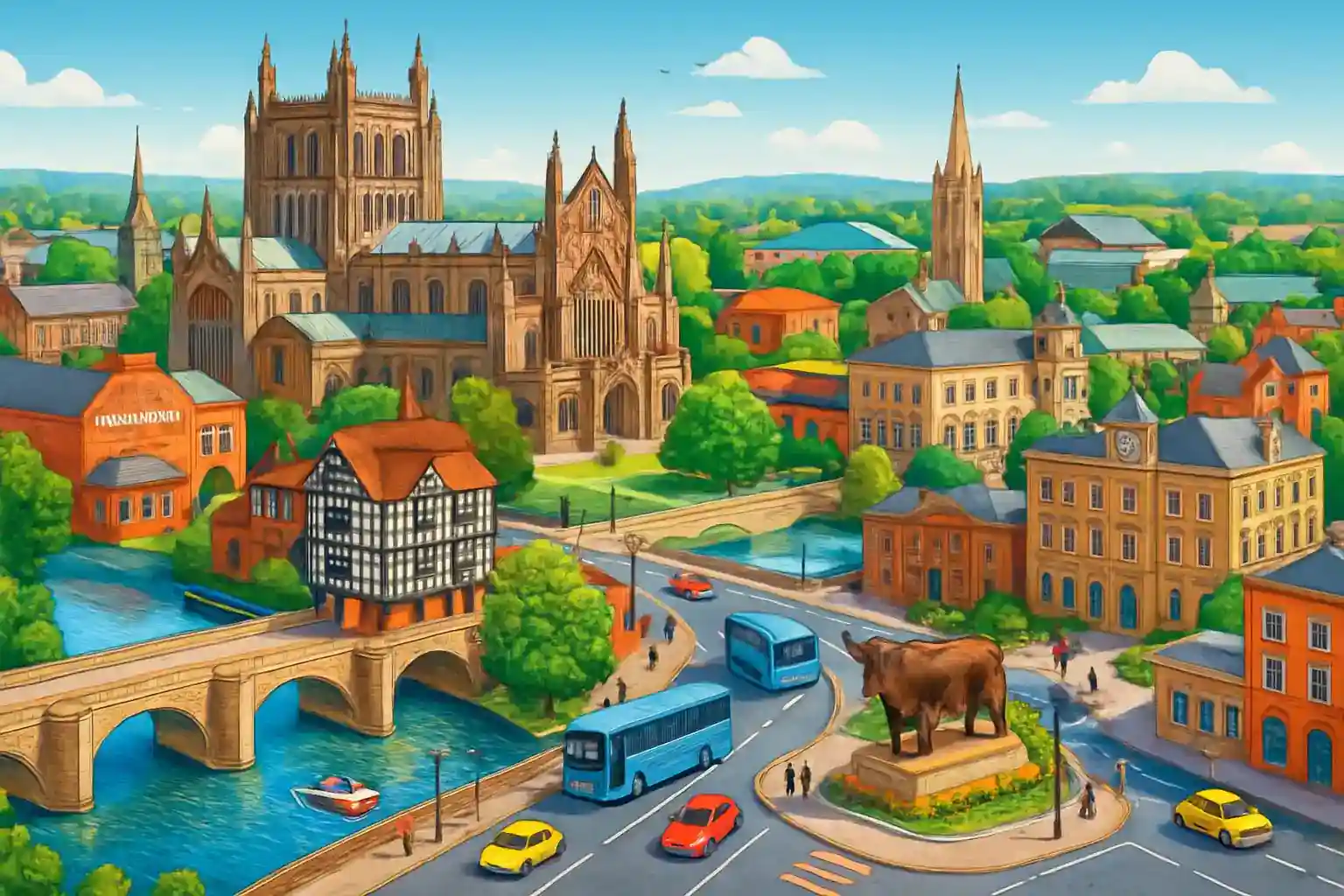 Hereford är känd för sin magnifika normandiska katedral med det unika Mappa Mundi från 1300-talet, belägen i hjärtat av staden. River Wye flödar genom staden och erbjuder pittoreska körvägar längs flodbanken. Herefordshire är äppelciderparadiset – Westons Cider Mill i Much Marcle ligger bara 20 km söderut.