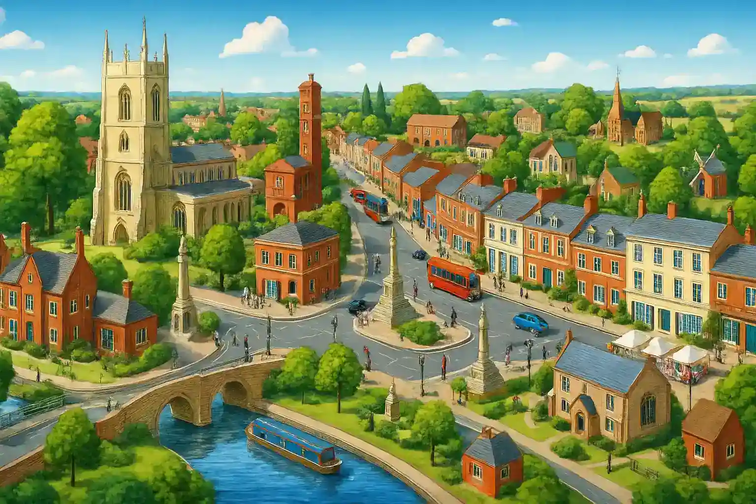 M1 junction 14 är precis utanför staden – perfekt för snabba resor norrut mot Leicester eller söderut mot London. Besök Olney, känd för sin pannkaksrace på fettisdagen, bara 10 km norrut. Parkera gratis på Priory Street Car Park i centrum.