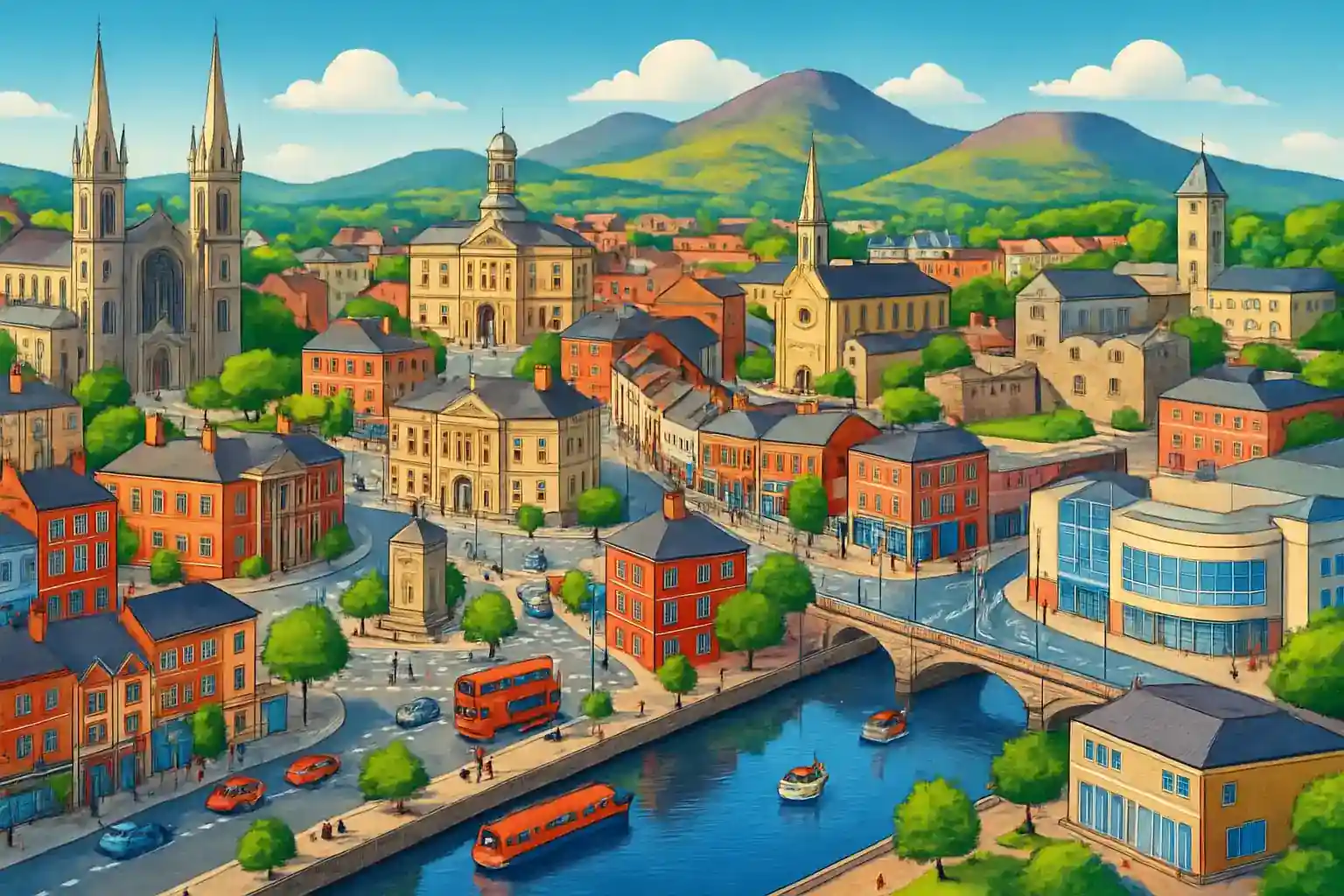 Circa 60 km norrut via A1, vilket tar ungefär 45–55 minuter. Vad finns det att se nära Bessbrook? Slieve Gullion Forest Park, Camlough Lake och det historiska Bessbrook Mill är alla inom 5 km.