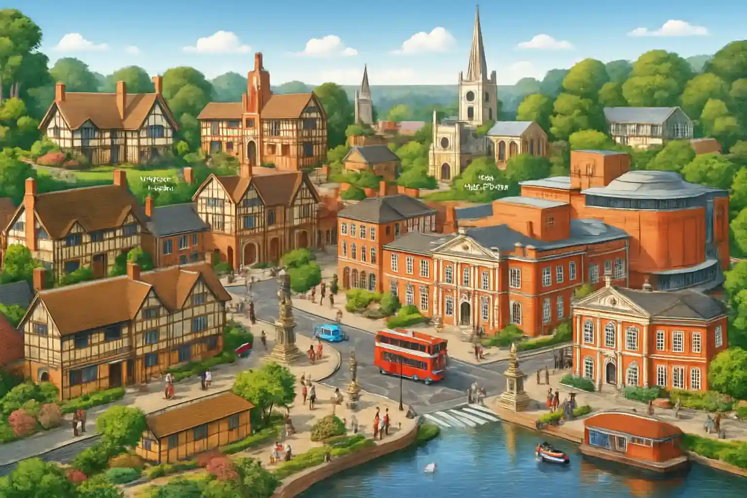 Shakespeare's Birthplace på Henley Street och Anne Hathaway's Cottage i Shottery (2 km väster) är oumbärliga stopp. Charlecote Park, ett nationaltrustgods med dovhjortar, ligger 7 km öster om centrum via B4086. Stratford centrum är trångt under turistsäsongen – parkera vid Leisure Centre (P&R) och gå in till centrum.