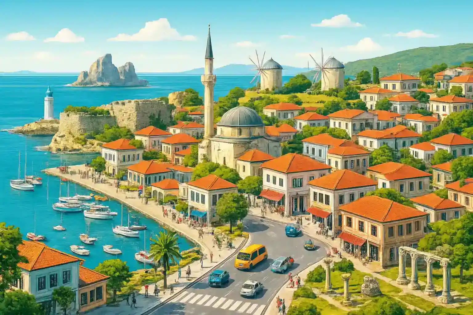 Ungefär 70 km söderut via D555, ca 55–60 minuters körning. Finns det sevärdheter nära Foça värda en bilutflykt? Ja, antikstaden Pergamon (Bergama) ligger 80 km norrut, ungefär 1,5 timmars körning via D555.