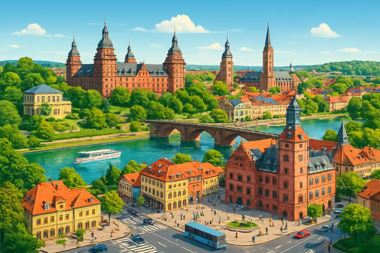 Schloss Johannisburg, ett av Tysklands vackraste renässansslott, ligger direkt vid Main i centrum. Aschaffenburg har utmärkt motorvägsförbindelser via A3 och A45, vilket gör Frankfurt (40 km, 35 min) och Würzburg (80 km, 55 min) lättillgängliga. Stadsparken Schönbusch med sitt lustslott ligger 3 km väster om centrum.