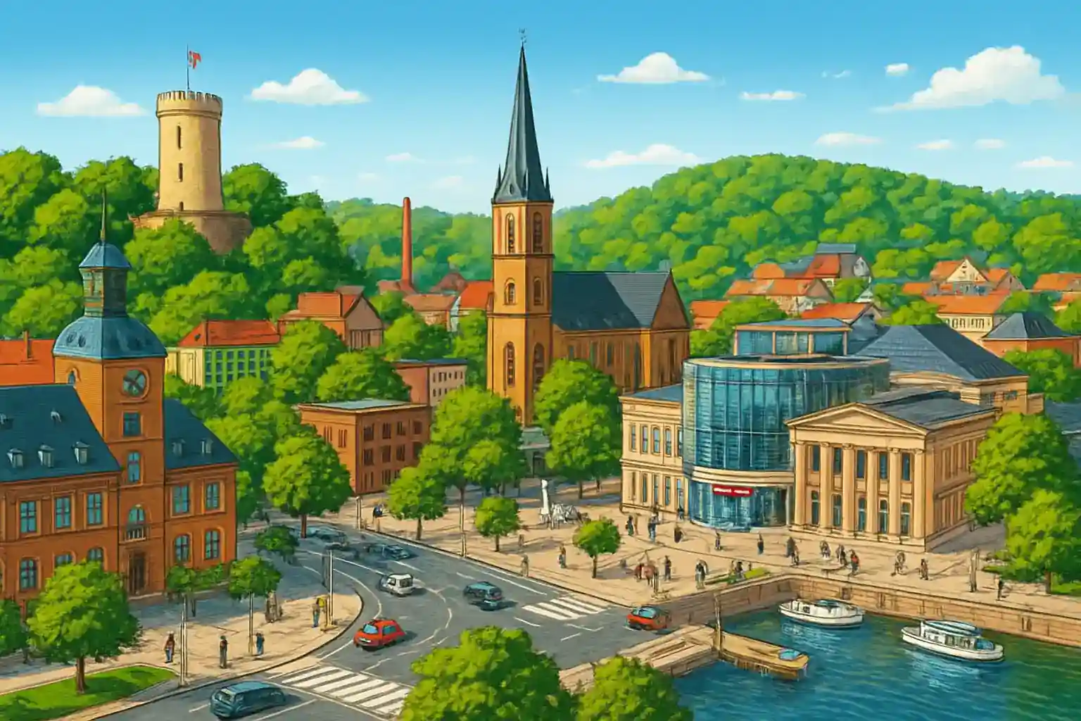 Parkering finns längs Bahnhofstraße nära centrum. Kör mot Bielefeld (25 km, ca 25 min via A30) för större shoppingmöjligheter. Var ligger hyrbildsstationen i Bünde centrum?