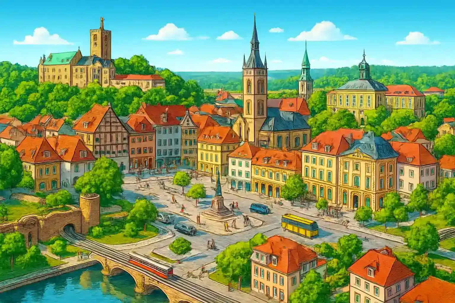 Kör Rennsteig-vägen längs Thüringer Walds krön för en av Tysklands vackraste landsvägsupplevelser. Besök Gotha ca 30 km österut med det magnifika slottet Friedenstein. Till Erfurt är det ca 60 km öster om Eisenach via A4, perfekt för en dagstur.