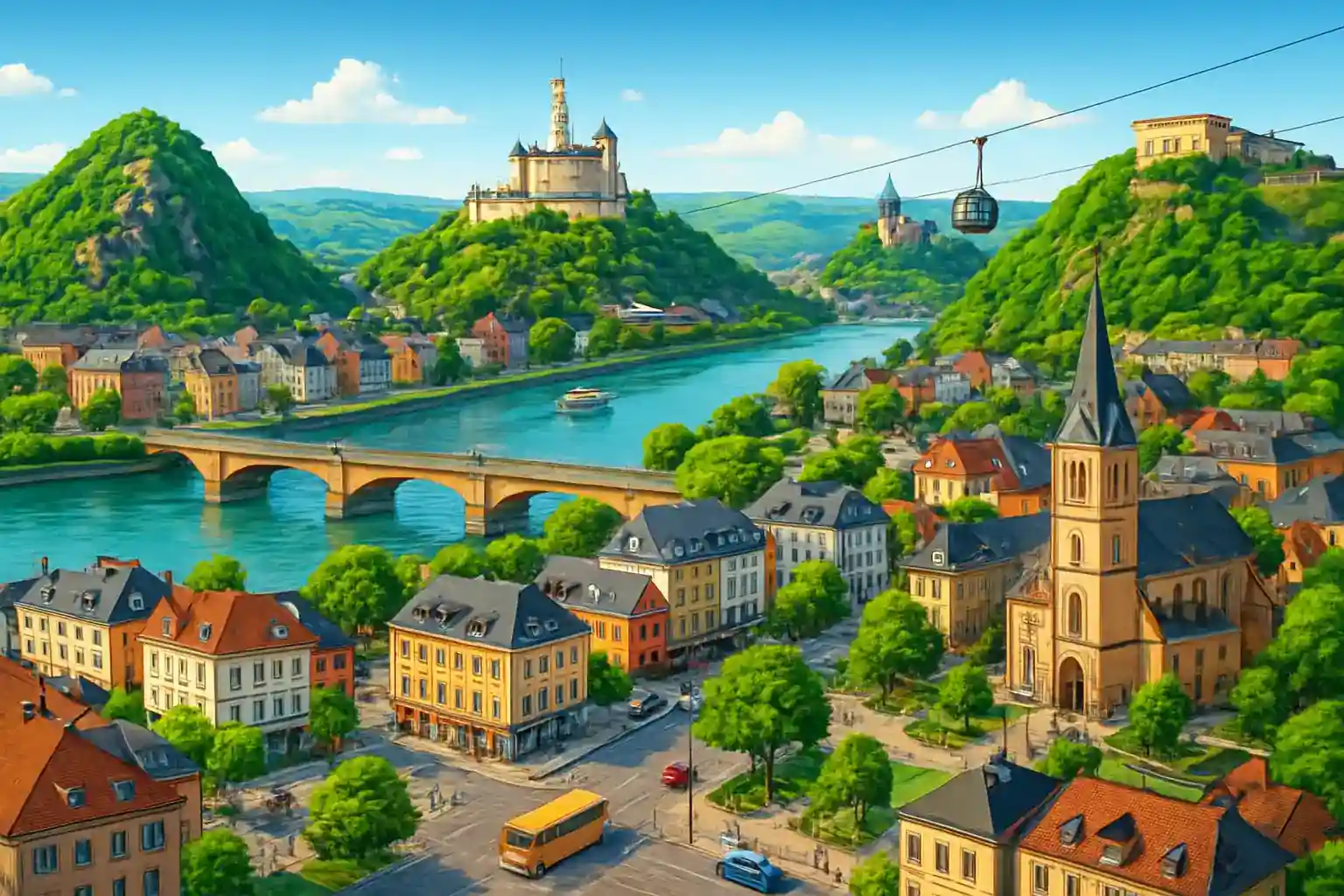 Kör ner till Boppard vid Rhen, ca 20 km, och ta stolen upp till Vierseenblick för en av Rhendalens bästa utsikter. Utforska Mosel-dalen från Cochem, ca 30 km söderut, med vinprovning och slottet Reichsburg. Kör norrut till Koblenz, ca 35 km, där Rhen och Mosel möts vid Deutsches Eck.