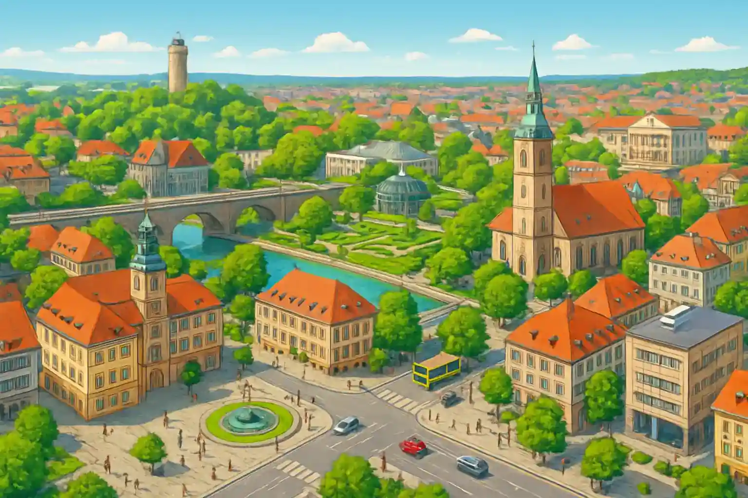 Erfurt, Thüringens huvudstad, ligger ca 70 km västerut, ungefär 50–60 minuters körning via A4. Är Gera ett bra alternativ till Leipzig för att hyra bil? Ja, med sju uthyrare och lägre priser än Leipzig är Gera ett utmärkt alternativ, särskilt om du ska utforska östra Thüringen.