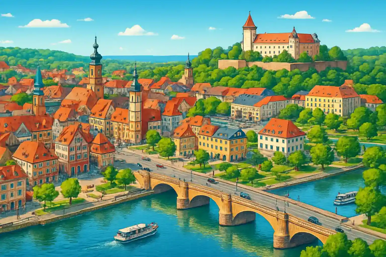 Kör längs Maintal-vägen mot Wertheim (40 km) för en av regionens vackraste floddalsrutter. Parkering i centrum är gratis på söndagar vilket underlättar avhämtning av hyrbilen.