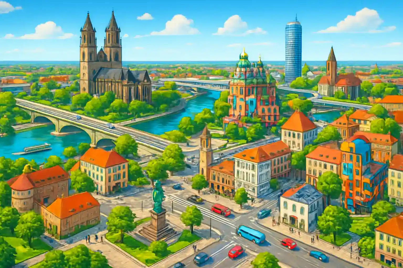 Magdeburg är känt för sin imponerande domkyrka från 1200-talet, bara 1 km från stationen, och det moderna Grüne Zitadelle designat av Hundertwasser. Elbepromenaden är ett populärt utflyktsmål ca 10 minuters promenad bort, och med bil når du Tangermünde på 45 km. Boka bil i förväg under sommarmånaderna då efterfrågan är hög.