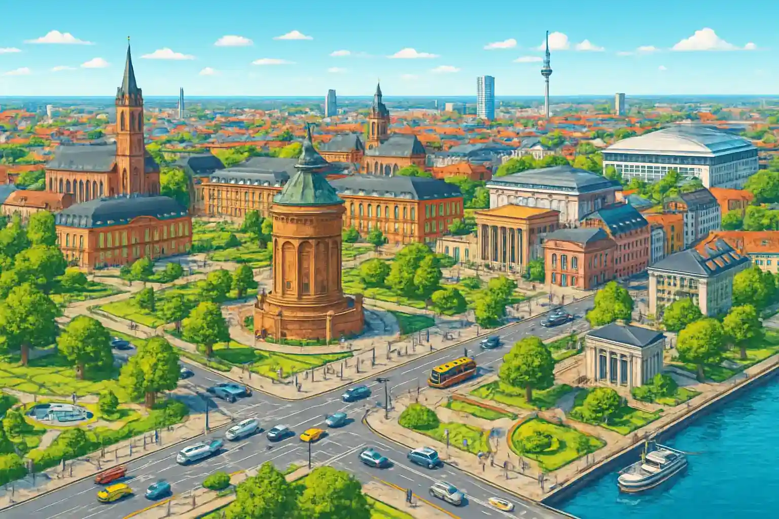 Mannheims centrum är uppbyggt som ett schackbräde med kvarter märkta med bokstäver och siffror, vilket gör navigering enkelt. Nationaltheater Mannheim, ett av Europas äldsta nationalteater, ligger i kvadrat N7. Luisenpark, en av Tysklands vackraste stadsparker, är 2 km från centrum och perfekt för en paus under bilresan.
