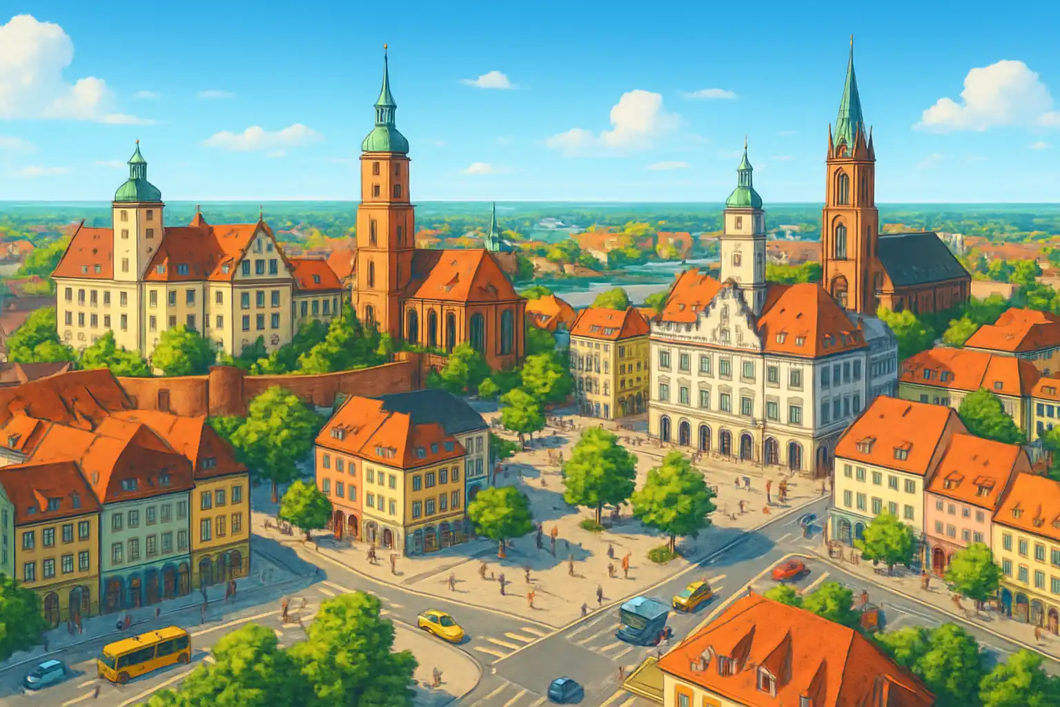 Neumarkt i der Oberpfalz är en charmig mellanstor stad i Bayern, belägen längs motorvägen A3 ungefär halvvägs mellan Nürnberg och Regensburg. Från stadens centrum når du Nürnberg på knappt 40 kilometer norrut, medan Regensburg med sin vackra medeltida stadskärna och UNESCO-listade gamla stad ligger drygt 50 kilometer österut. Utflyktsmöjligheterna är många: det böljande Oberpfalz-landskapet bjuder på pittoreska byar, kloster och vandringsleder, och natursköna Altmühltal-dalen med sina kalkstensklippor och kanaler är nåbar på bara en halvtimmes körning söderut.