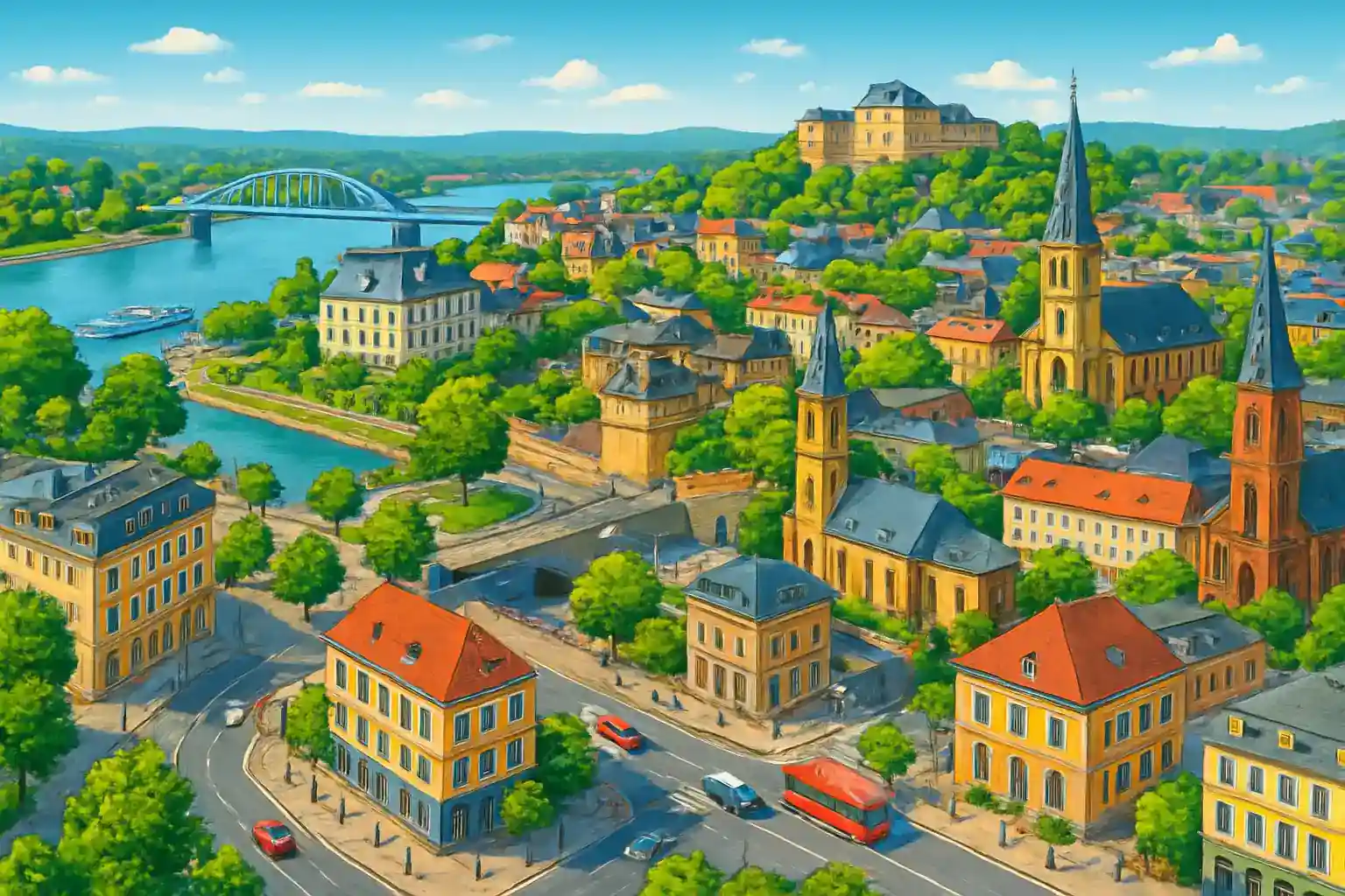 Hur långt är det till Koblenz från Neuwied? Koblenz ligger ca 15 km söderut, ungefär 15–20 minuters körning via B9. Är det möjligt att hyra bil för en dag i Neuwied?