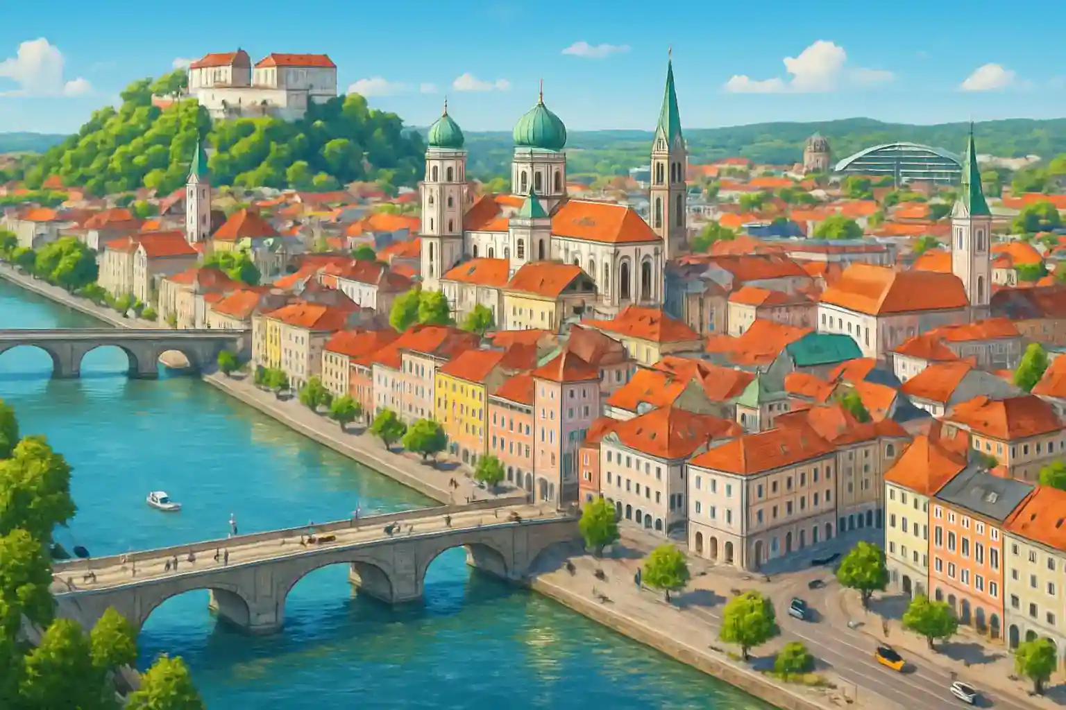 Passaus barockstadssilhuett med domkyrkan St. Stephan, hem till världens största kyrkorgelorgel, dominerar stadsbilden 500 meter från centrum. Veste Oberhaus på berget ovanför staden ger fantastisk utsikt över de tre floderna och nås med bil på 5 minuter.