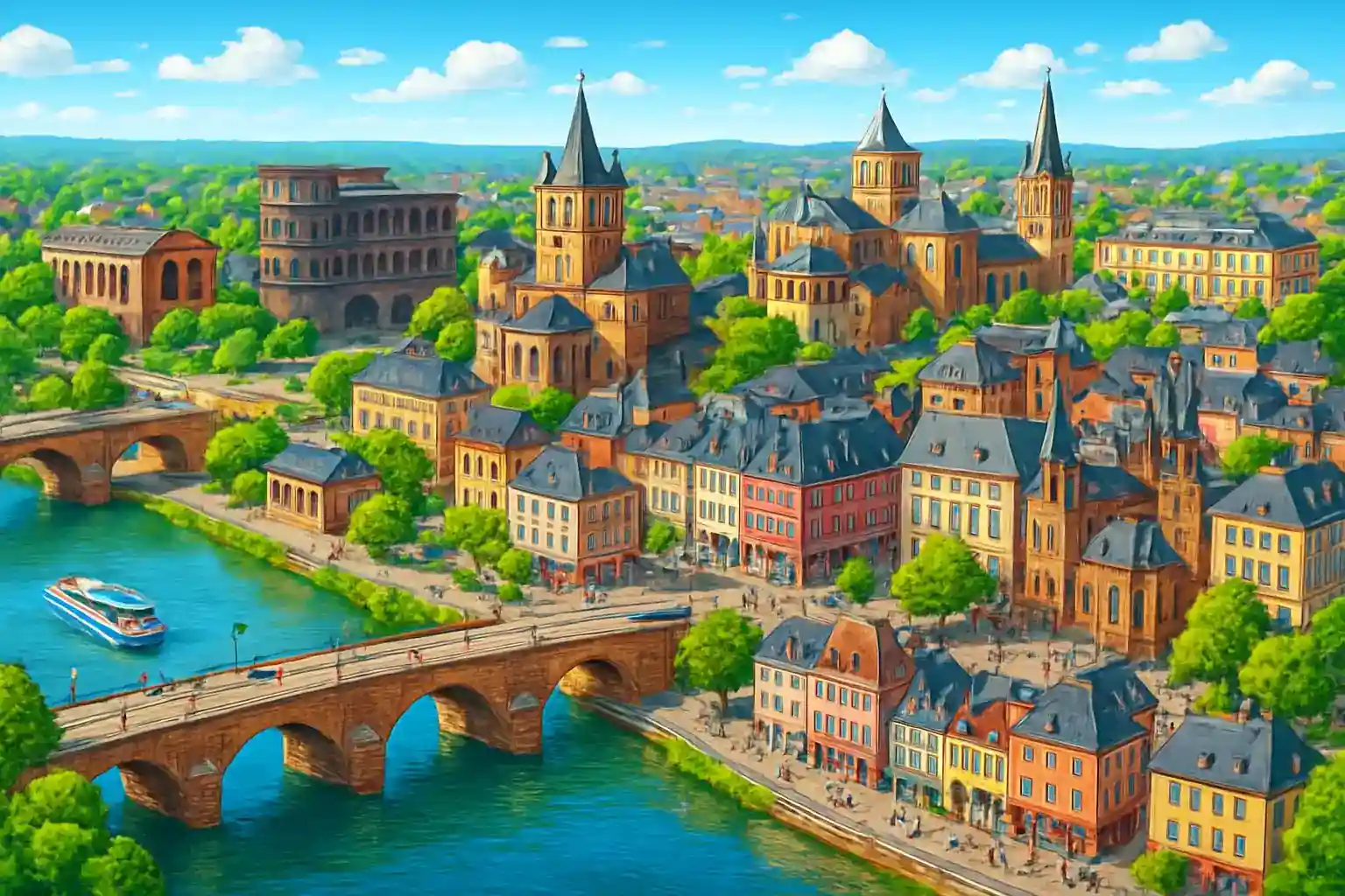 Trier ligger vid floden Mosel nära gränsen till Luxemburg, bara 50 km från Luxemburg stad. Staden är känd för sina välbevarade romerska monument som ingår på Unescos världsarvslista, däribland amfiteatern och kejsarbadet. Boka bil i god tid under sommarens vintersäsong då turisttrycket är högt.
