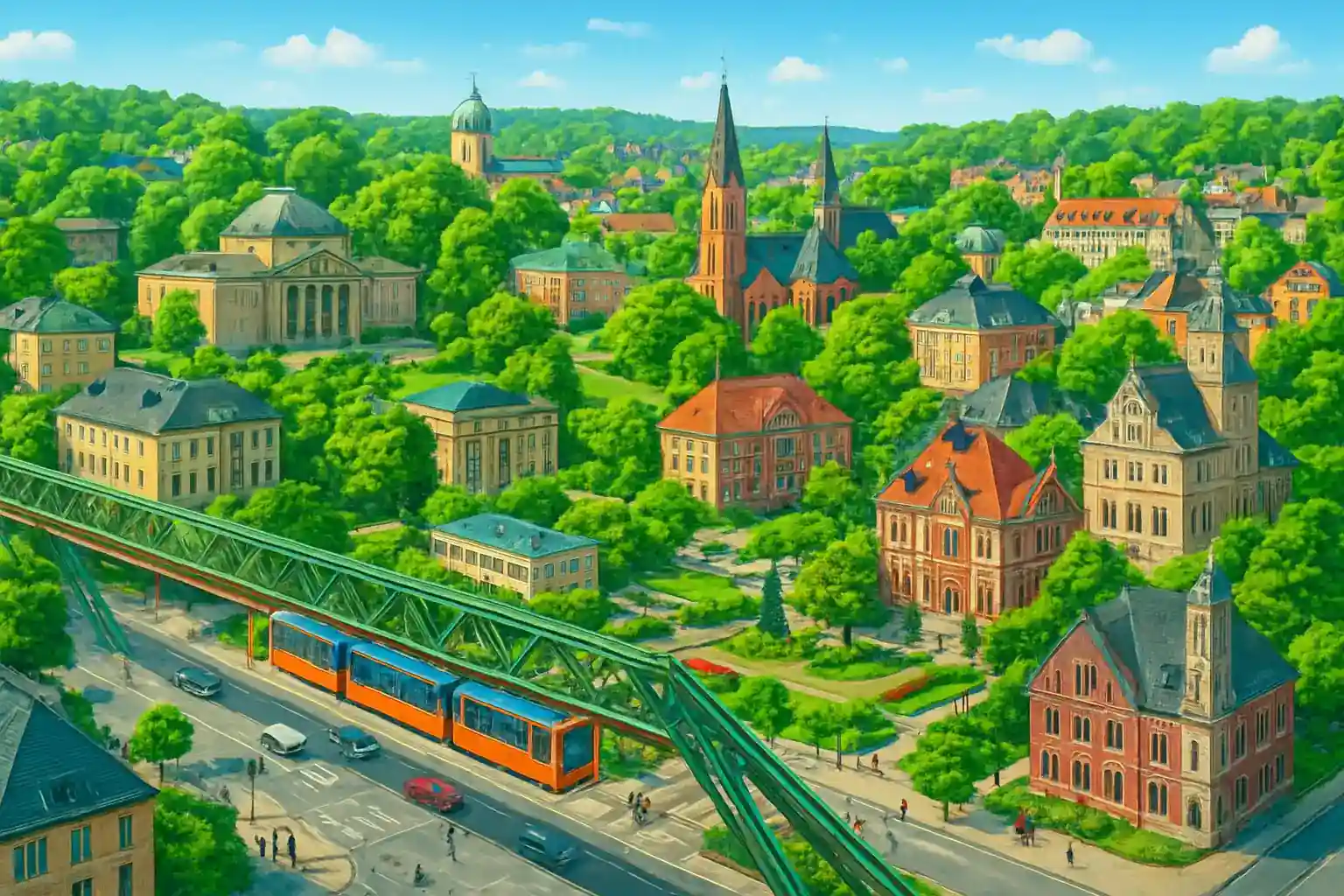 Hur lång tid tar det från Barmen till Düsseldorf? Ca 35–45 minuter, ungefär 40 km västerut via A46 beroende på trafikläget. Kan jag parkera hyrbilen nära Schwebebahn-stationen i Barmen?