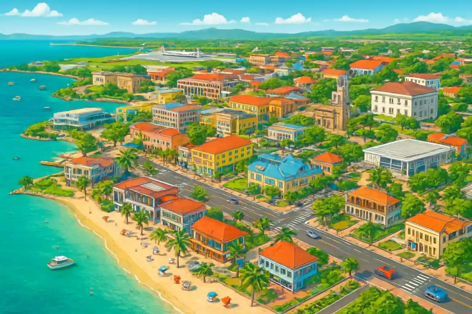 Kör västerut på A1 ca 80 km, vilket tar 1,5–2 timmar. Vägen är välskyltat och relativt enkel att navigera dagtid. Finns det parkeringsmöjligheter för hyrbilen vid strandhotellen?