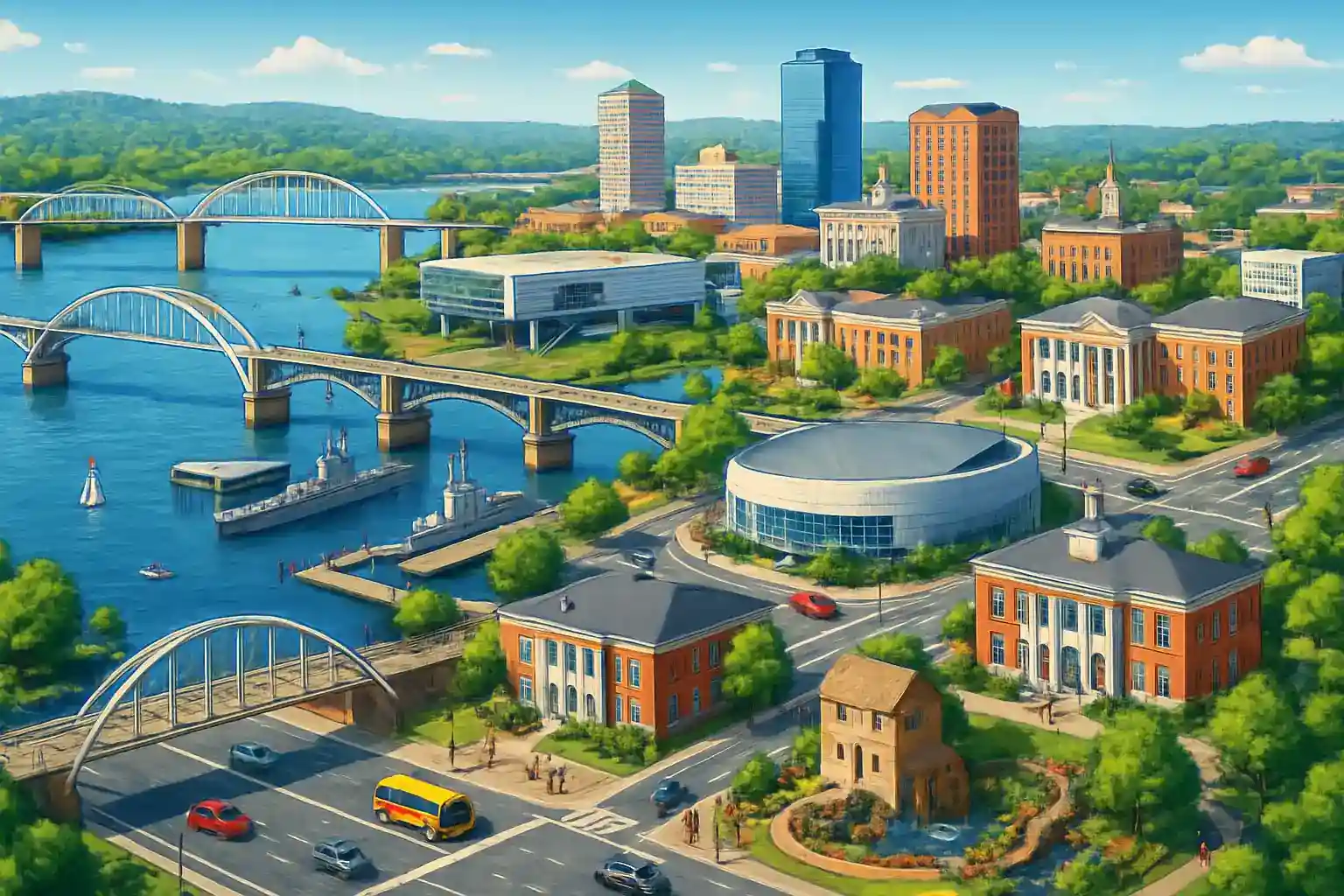 Härifrån är det bara 5 km till Little Rocks downtown via Broadway Bridge, och ca 80 km till Conway norrut på I-40. Pinnacle Mountain State Park nås på ca 25 minuter västerut. Att hyra i centrum istället för flygplatsen kan spara 10–15% då flygplatstillägg undviks.