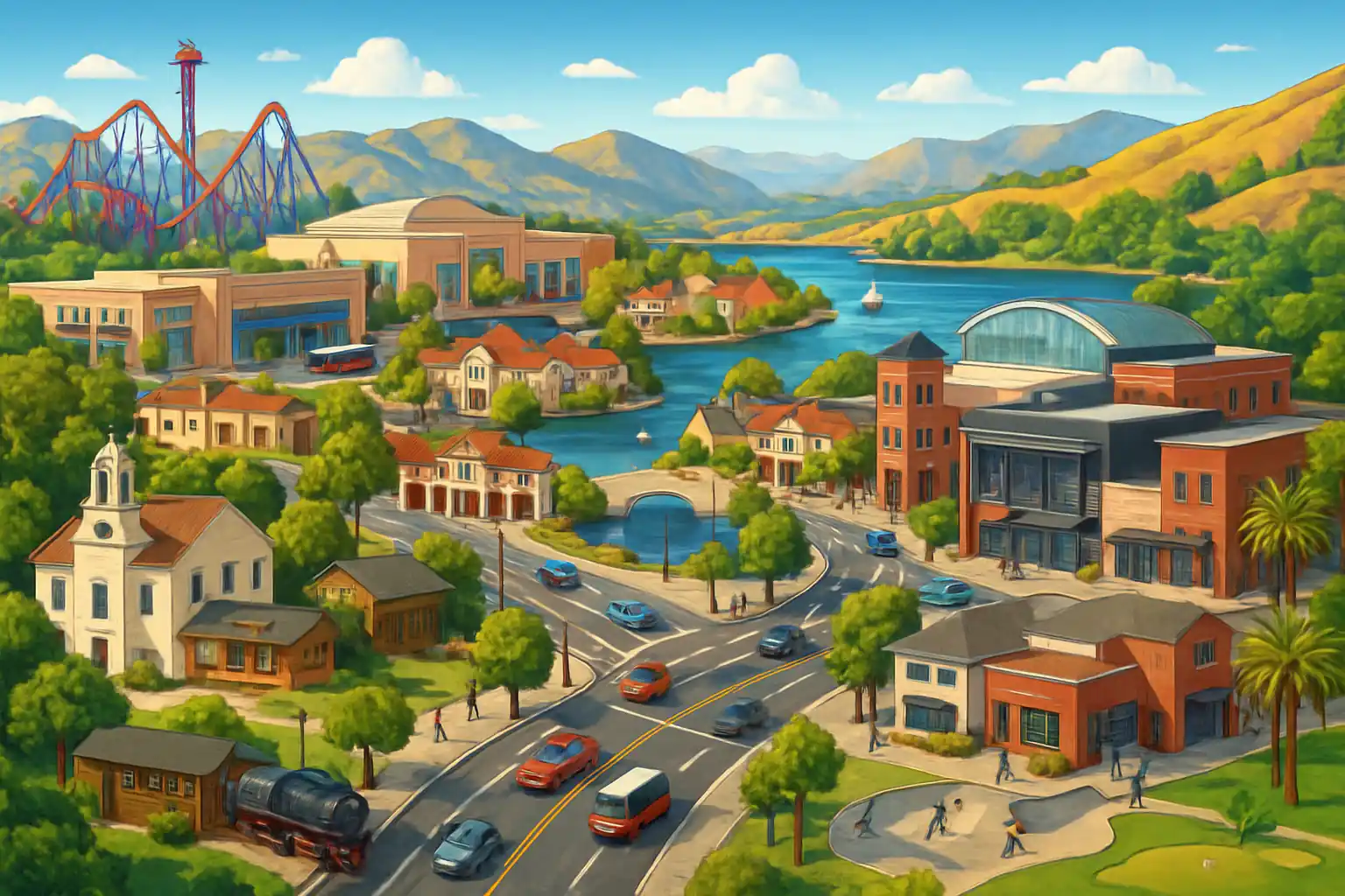 Six Flags Magic Mountain med sina 19 berg-och-dalbanor ligger vid Valencia Boulevard, 5 km söderut. Vasquez Rocks Natural Area Park, med sina dramatiska klippformationer som synts i otaliga filmer, nås på 20 minuter östut via Highway 14. Old Town Newhall med restauranger och butiker längs San Fernando Road är 8 km bort.