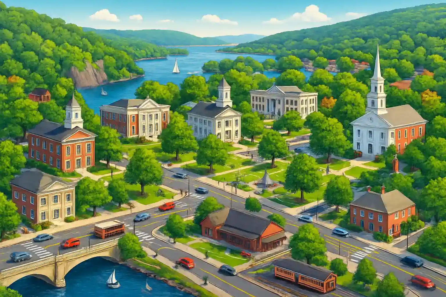 Kör norrut längs Route 7 för att uppleva Litchfield Hills fantastiska höstfärger – bäst september–oktober. New Milford centrum har gratis parkering vid the Green, praktiskt för att utforska butiker och restauranger. Besök Kent Falls State Park ca 30 km norrut för ett av Connecticuts vackraste vattenfall.