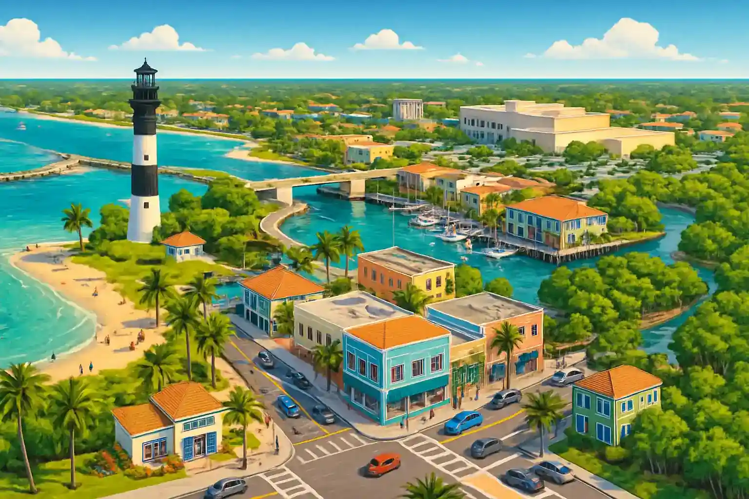 Boynton Beach centrum ligger längs Federal Highway (US-1) och erbjuder enkel tillgång till både kustvägen A1A och I-95. Ocean Ridge och Boynton Beach Inlet är bara 5 km österut, perfekt för strandbesök och sportfiske. Kör norrut på A1A längs Atlantkusten för en av Floridas vackraste kustvägar.