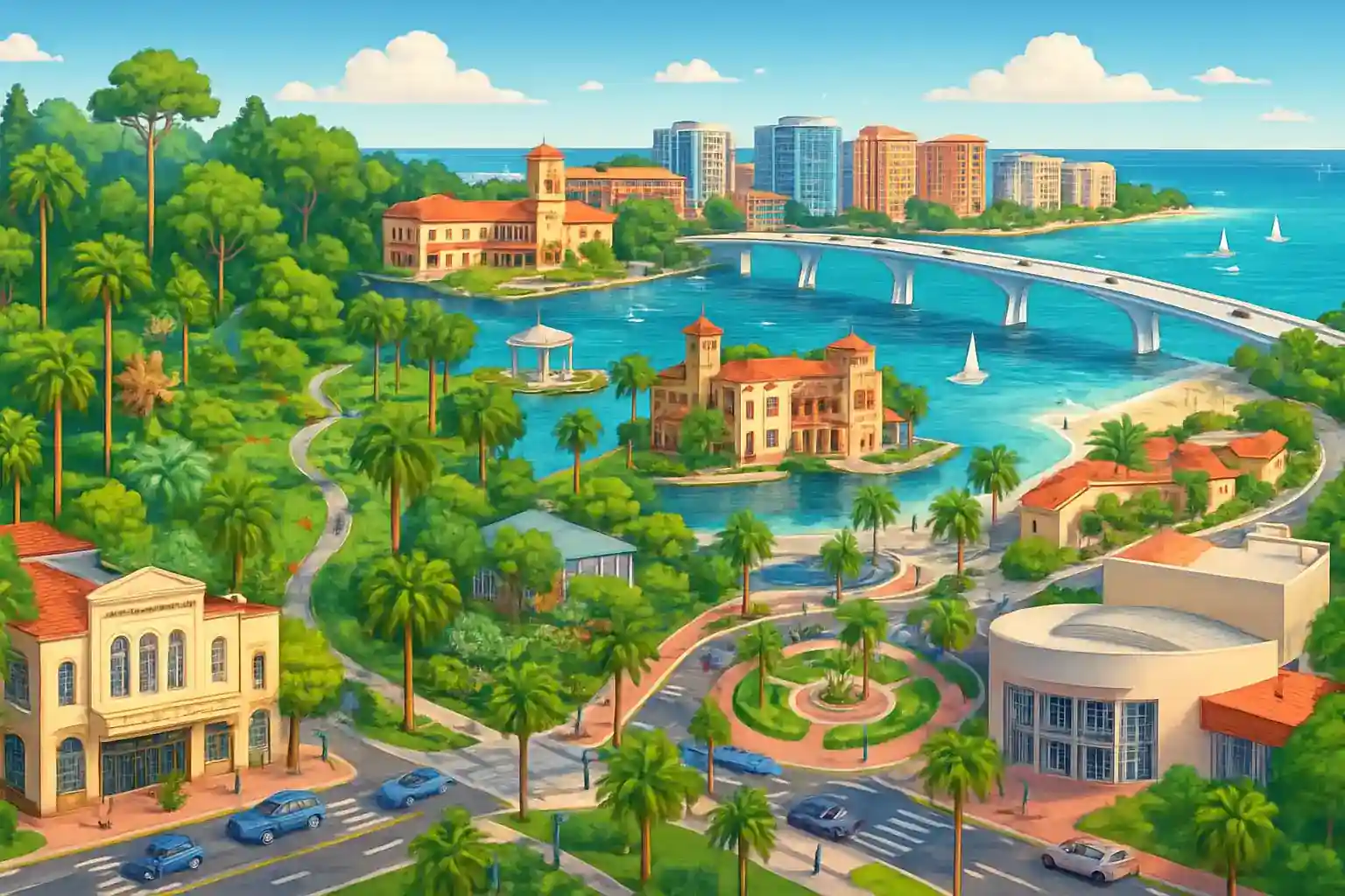 Härifrån når du Siesta Key, rankad som USA:s bästa strand, på ca 20 minuters körning söderut via US-41. Med 10 uthyrare på SRQ är konkurrensen god – jämför priser online innan du anländer för bästa deal. Planerar du att utforska Anna Maria Island, räkna med ca 30 km norrut via US-41 och Manatee Avenue.