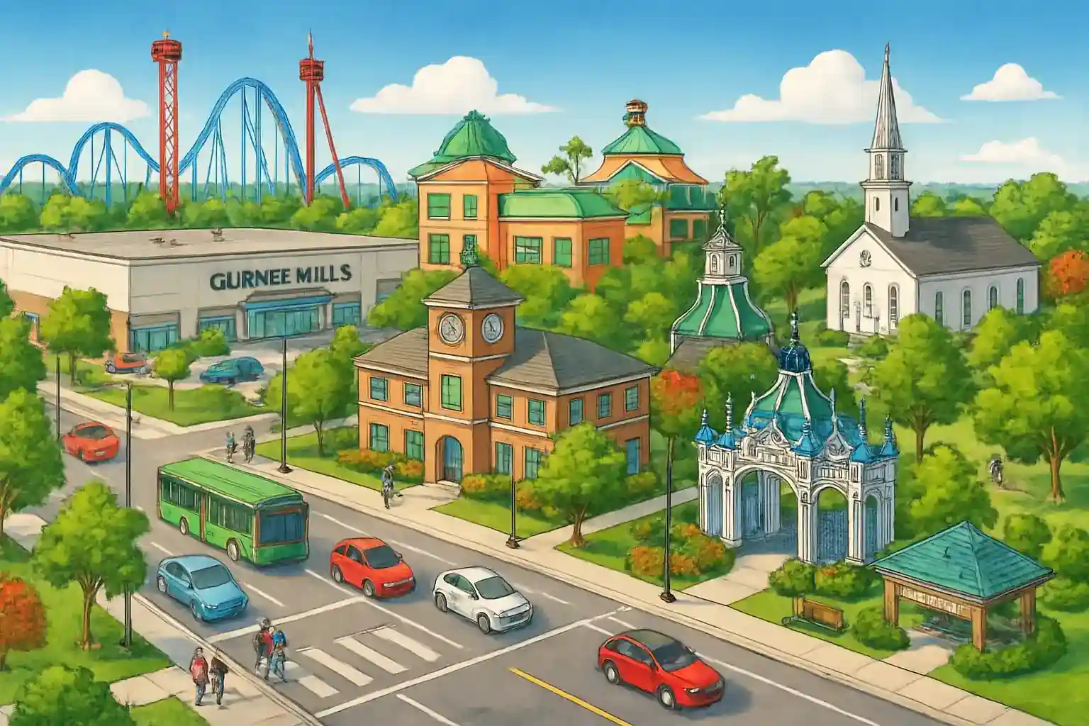 Gurnee i Lake County är känd som hem för Six Flags Great America och erbjuder hyrbil via 2 uthyrare i centrum. Staden ligger längs I-94 nära gränsen till Wisconsin, perfekt för resor norrut eller söderut längs sjökusten. Från Gurnee centrum tar det ca 50 minuter (55 km) söderut till Chicago Loop via I-94.